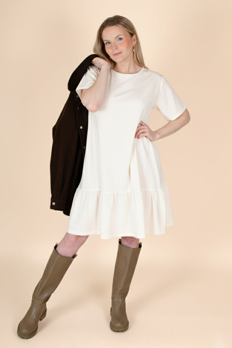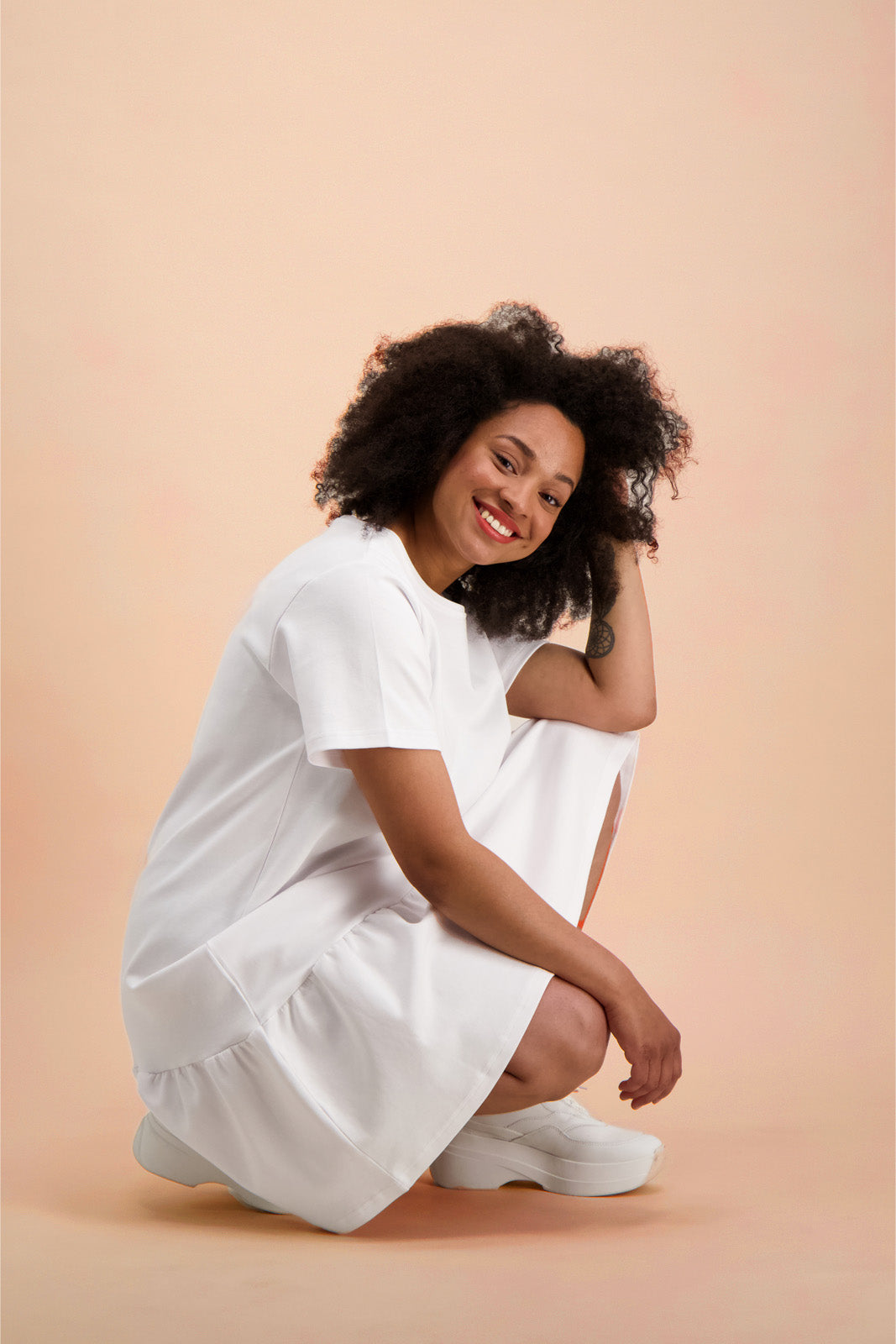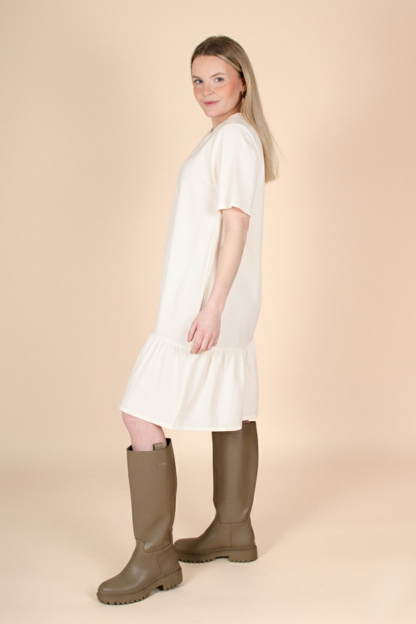 Skarppi Ruffle T-shirt Dress made of high-quality, comfortably thick and sturdy cotton jersey. The dress has a relaxed fit, slightly longer t-shirt sleeves and a playful frill at the hem. Warm blonde in tone. Easy to combine with everyday wear and parties, as well as different seasons.