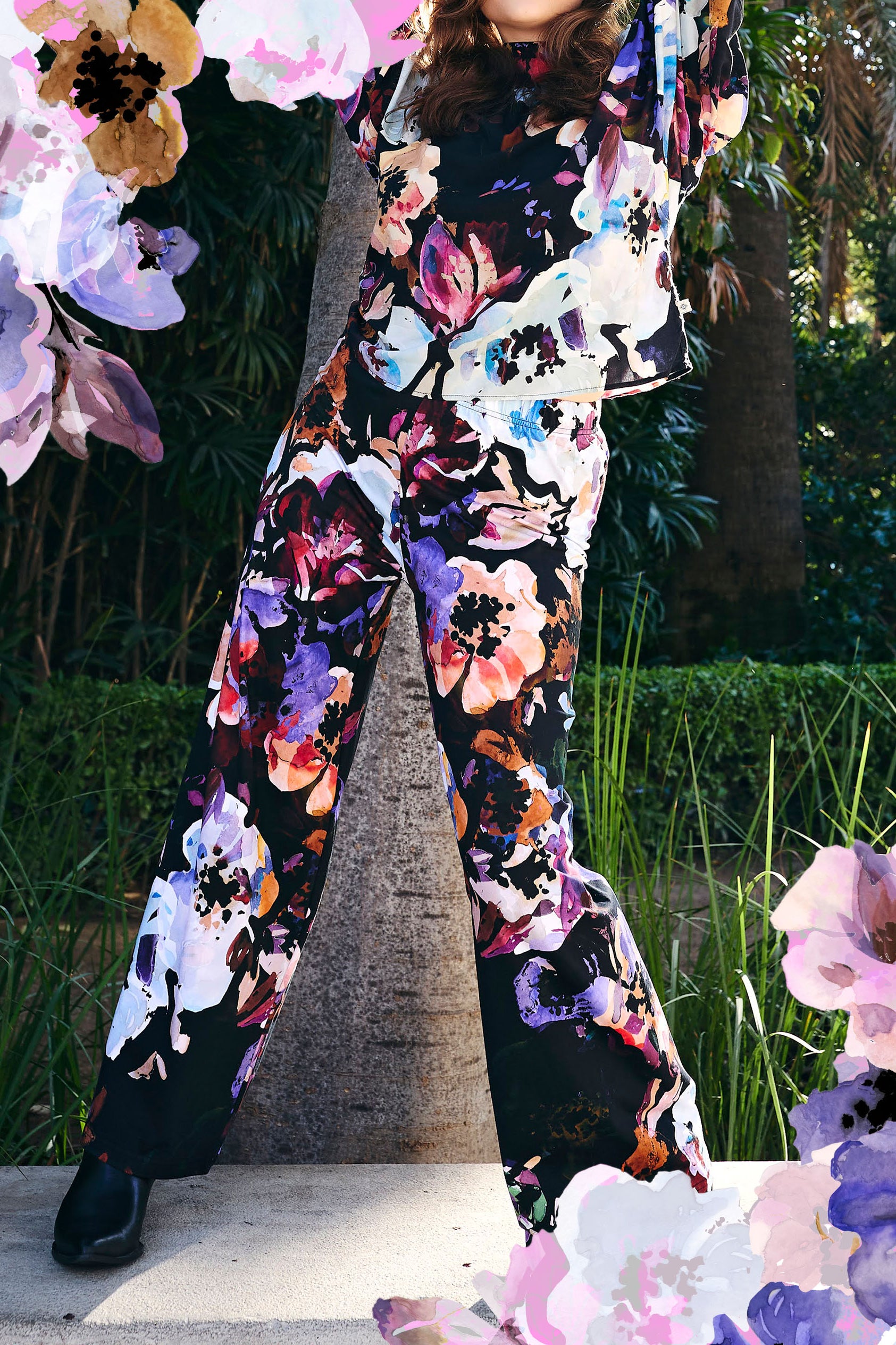The Midi Belted Dress, made of soft organic cotton tricot, has a feminine and close-fitting design. The side seams of the dress have wide bands that emphasize the waist, which can be tied either in front or behind. The length of the hem is about the sole of the foot, and there are 20 cm slits in the side seams. The dress has long sleeves. The Midi Belted Dress is easy to style for both weekdays and parties. Black Anemone as a tricot dress, where large watercolor flowers sprawl on a black background.