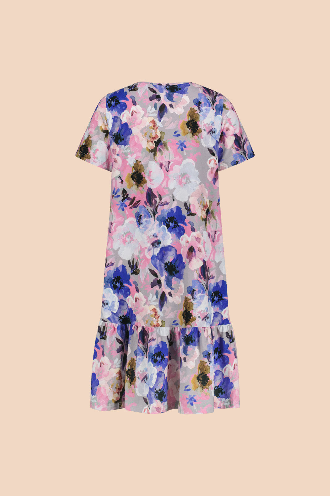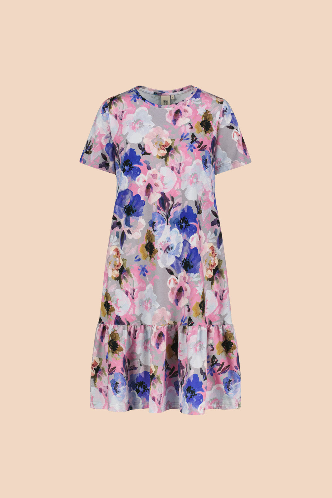 This women's dress will charm you with its relaxed fit and playful details - slightly extended t-shirt sleeves and a frill at the hem create a relaxed silhouette.