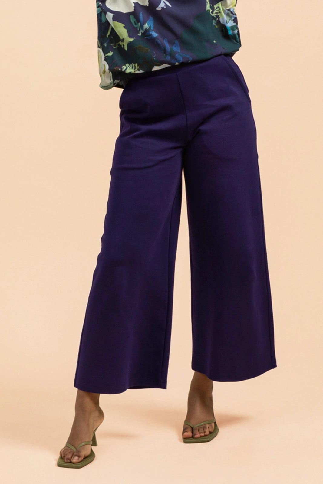 When you want neat pants that don't compromise on comfort, Everyday Culottes pants are a sure choice. The pants, made of sturdy and flexible Ponte roma interlock knit, look sharp, but feel wonderfully soft when worn. The pants have a wide elastic waist (5 cm high) and front pockets. The side seams have denim stitching, which gives the pants an extra sharp feel. The color is classic dark blue.
