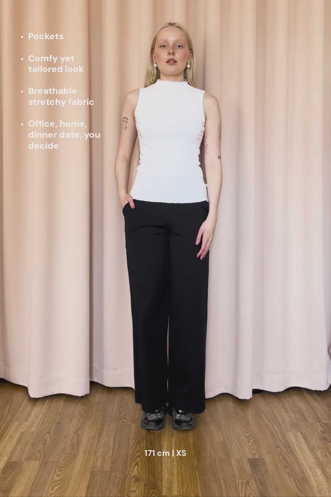 Smart & casual Everyday Pants do not compromise on comfort. The pants, made of sturdy and flexible Ponte roma interlock knit, look sharp, and feel wonderfully soft when worn. The pants have a wide elastic waist (5 cm high) and front pockets. The side seams have denim stitching, which gives the pants an extra sharp feel. The trousers have a full-length leg (see the inseam lengths in the measurement table). The color of the pants is black.