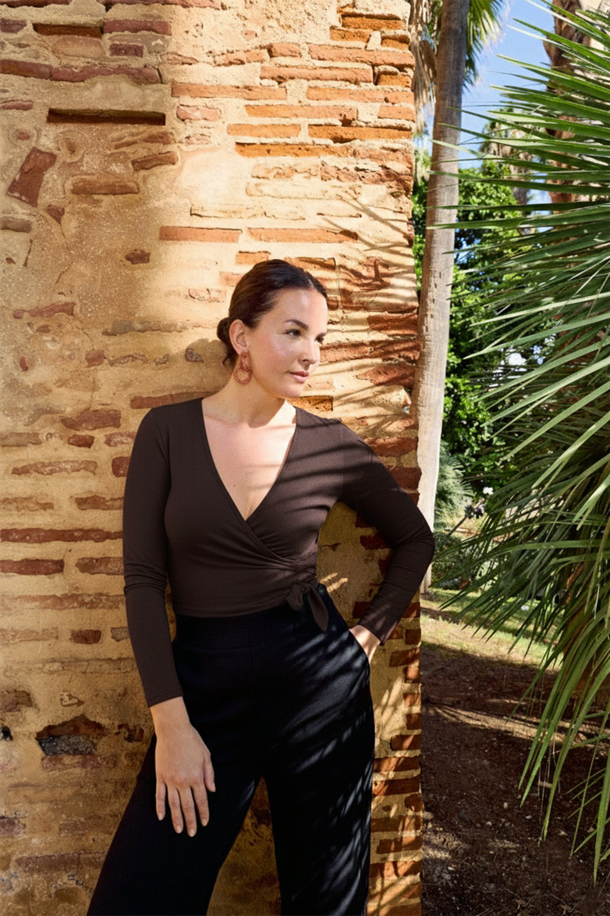 The Wrap Top is a versatile and timeless wrap top that adapts to a variety of uses and styles. It works beautifully in everyday life as well as more formal ensembles, and is also perfect for light exercise.