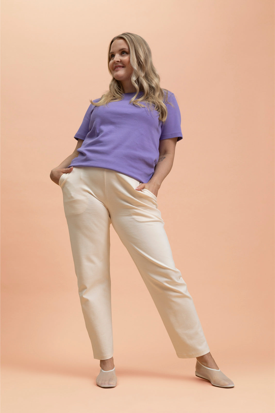 When you want neat trousers that don't compromise on comfort, Comfy Slacks are a sure choice. Made from thick and stretchy ponte roma interlock, the trousers follow the spirit of straight trousers, but feel wonderfully soft on the skin. The trousers have a wide elastic waist (5 cm high) and pockets at the front. Shaped pleats at the back ensure a good fit. Denim stitching runs along the side seams, which gives the trousers an extra-sharp feel.