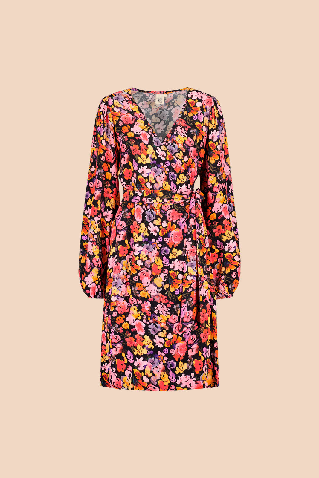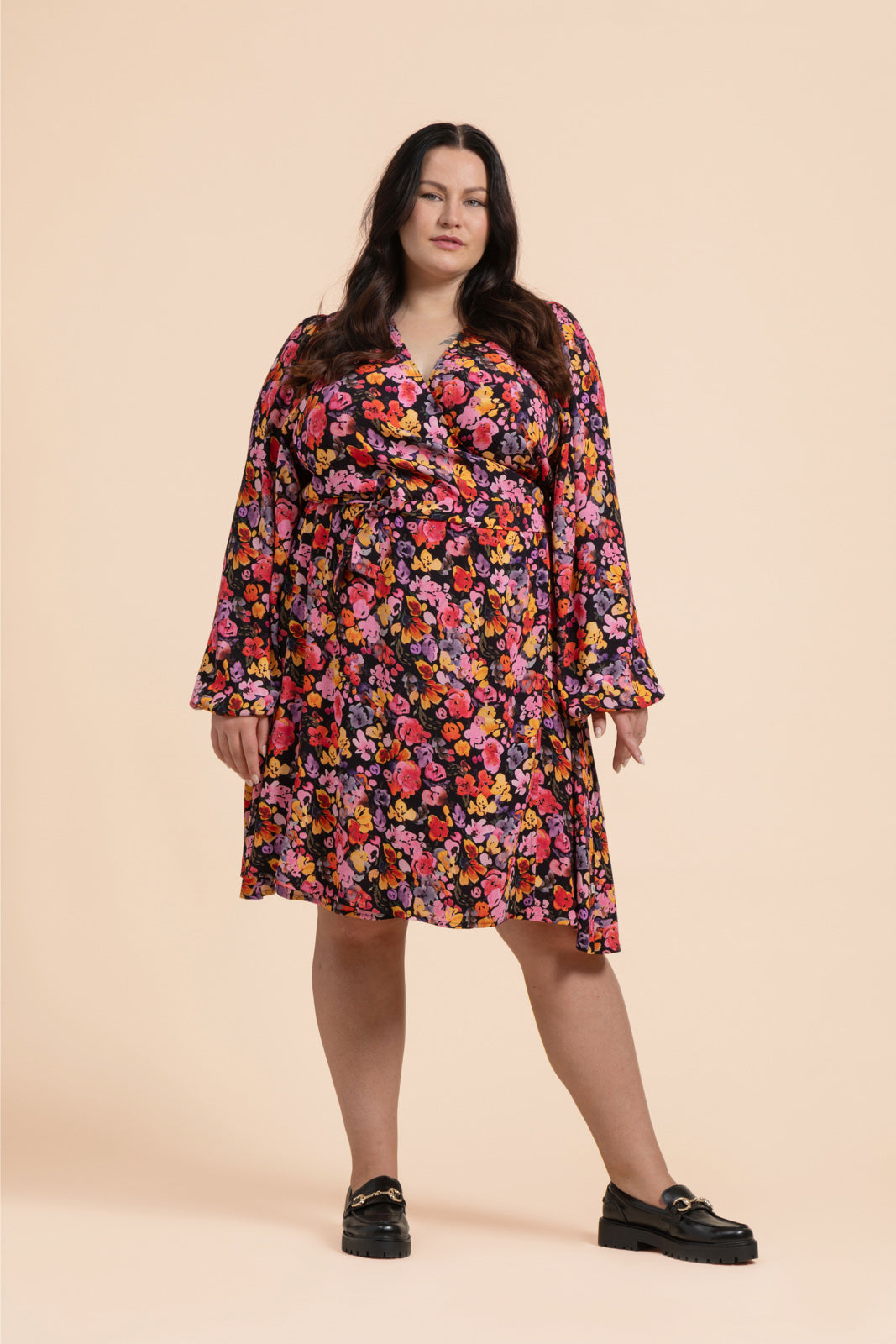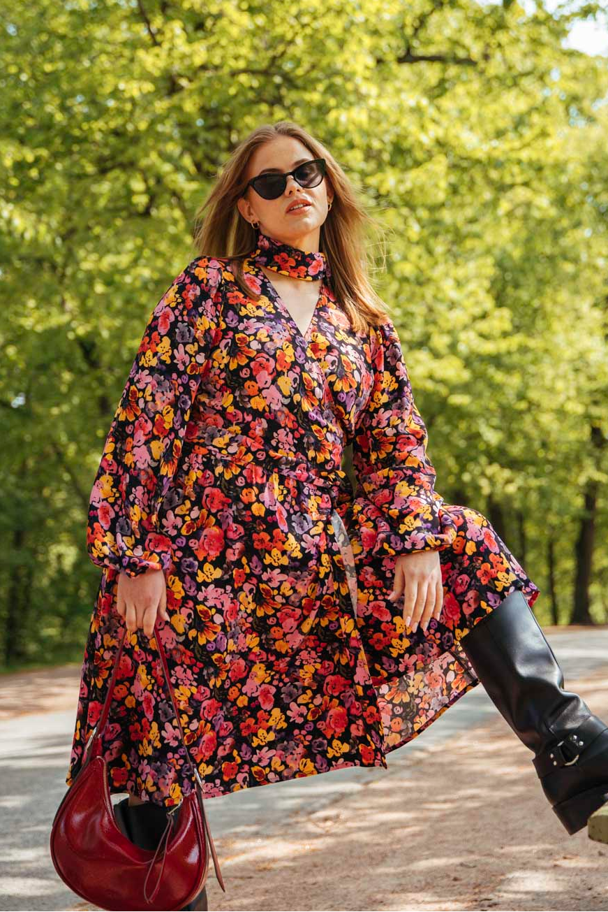 The Wild Lea pattern features a colorful floral pattern on a soft base. This high-quality women's wrap dress is designed and made to last for years to come.