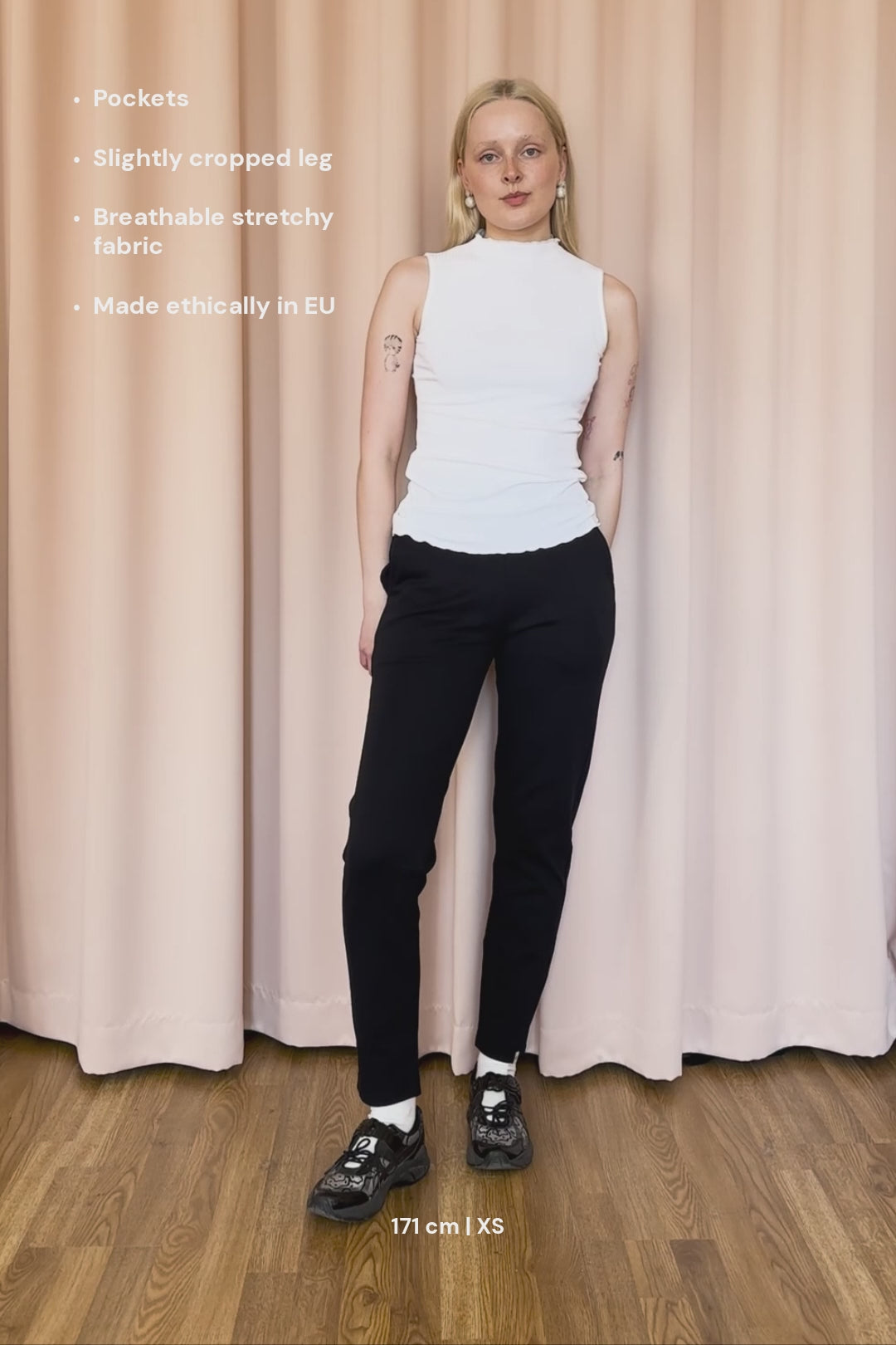 When you want neat pants that don't compromise on comfort, Comfy Slacks pants are a sure choice. The pants, made of sturdy and flexible Ponte roma interlock knit, follow the spirit of straight pants, but feel wonderfully soft when worn. The pants have a wide elastic waist (5 cm high) and front pockets. Form pleats at the back, which guarantee a good fit. The side seams have denim stitching, which gives the pants an extra sharp feel. The color is classic black.