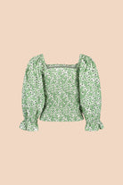 The large puff sleeves are designed for versatility: elastic bands on the shoulder keep the sleeves firmly in place, and if you want, you can create an off-shoulder style by pulling the sleeves down from the shoulders. The short-length cuffs have beautifully gathered frill details, and the midi-length flared hem is decorated with a charming frill. The pattern is timeless Daisy, with daisies sprawling on a green background.