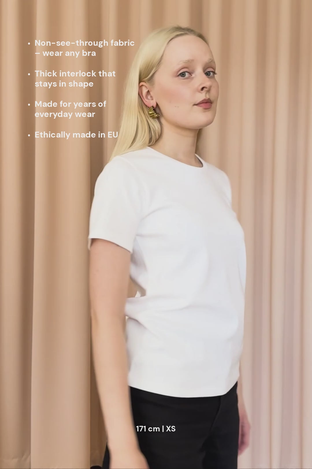"A slightly thicker material that keeps its shape well in the wash. A high-quality T-shirt, a cornerstone of every wardrobe. I have the same T-shirt in black, which I ordered earlier based on recommendations. The shirt has not been praised for nothing and I can sincerely recommend it!" -Riitta