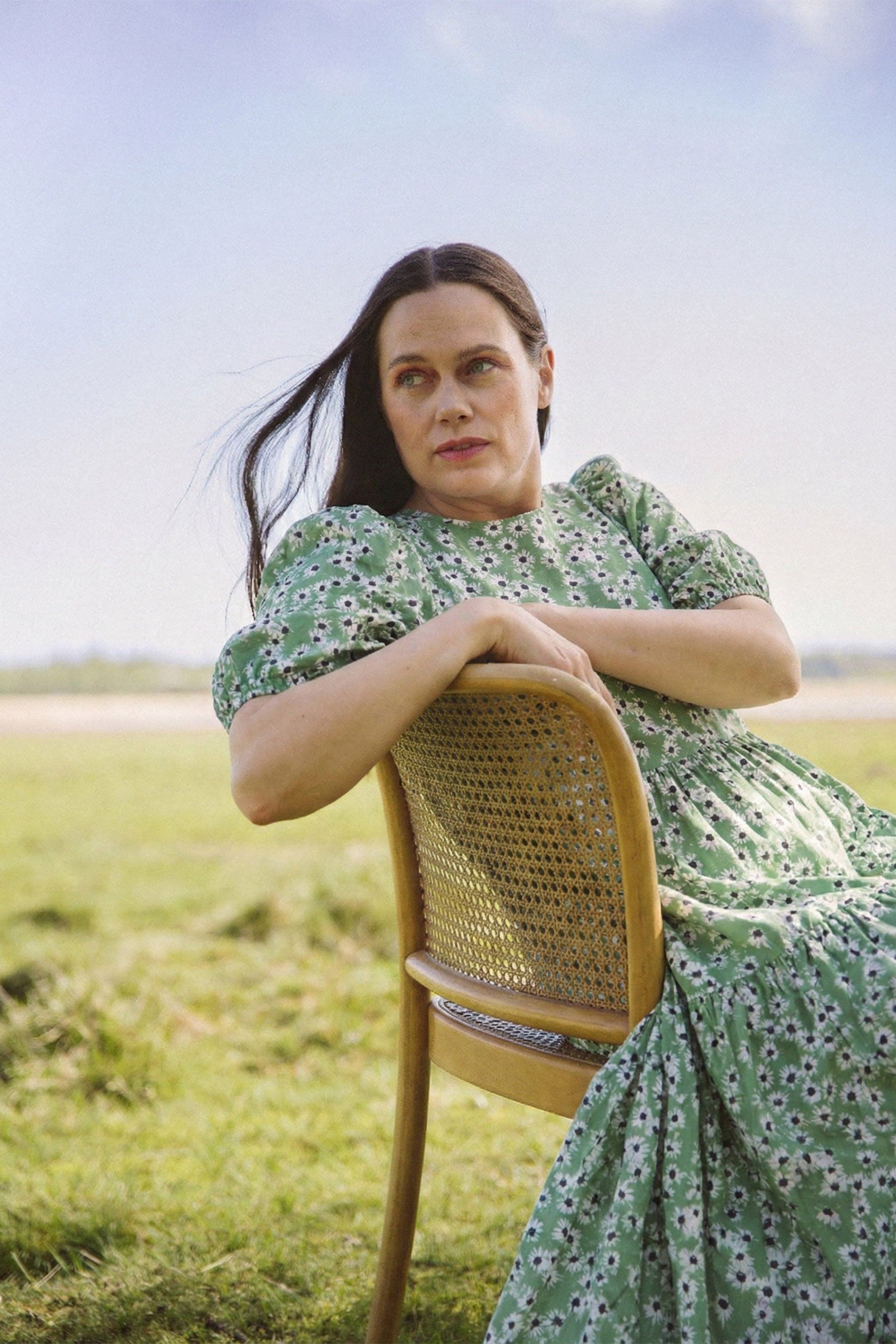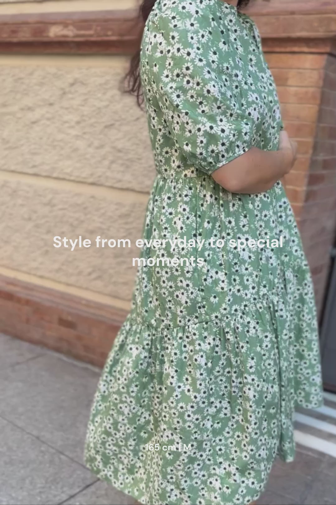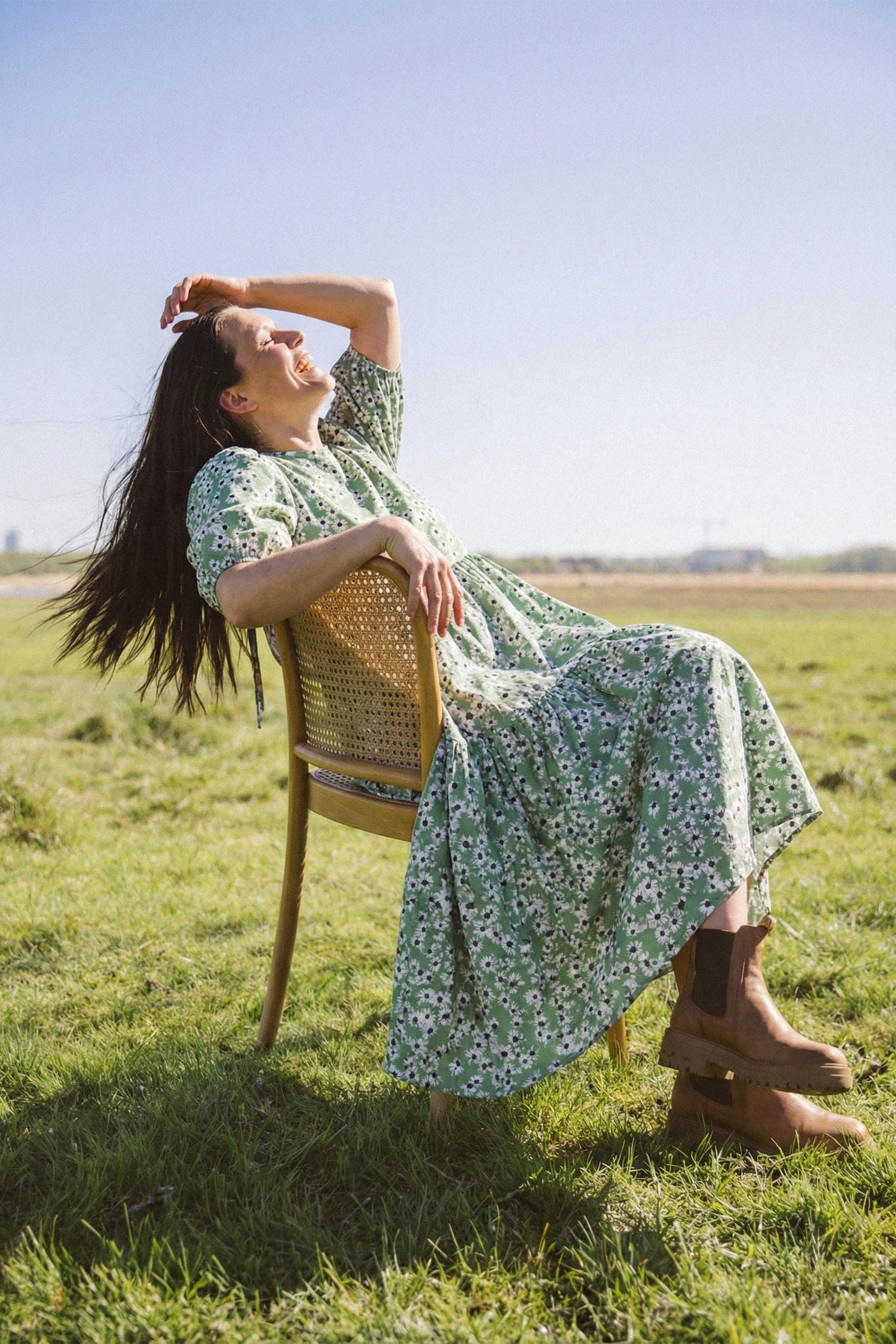 A versatile and striking dress that is perfect for both everyday wear and parties. The loose cut features half-length puff sleeves and a generous layered midi-length hem that is slightly longer at the back. A lace-up fastening at the neck and a deep slit at the center back seam that reaches the waist seam complete the dress's elegant look. Patterned Daisy Sage.