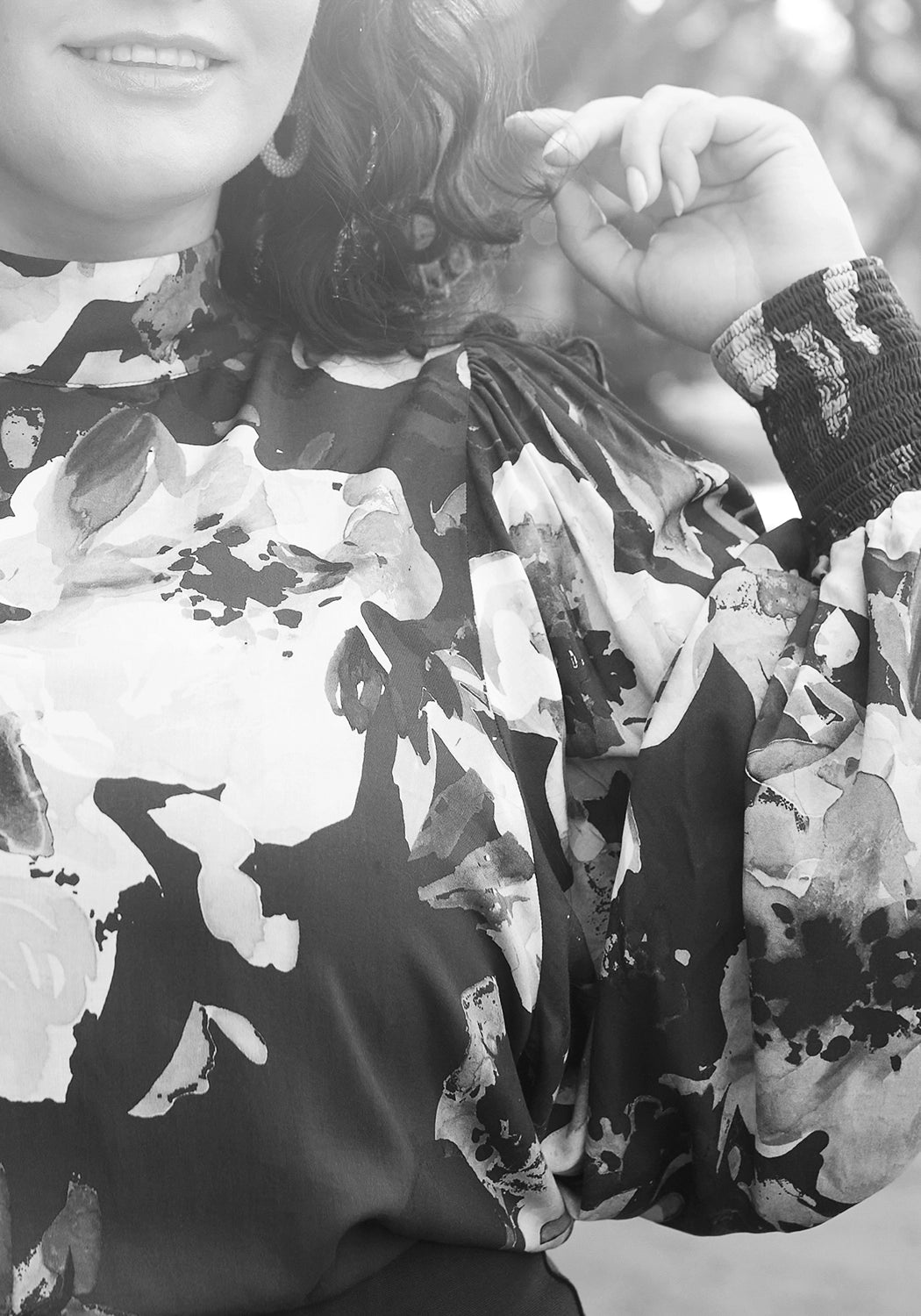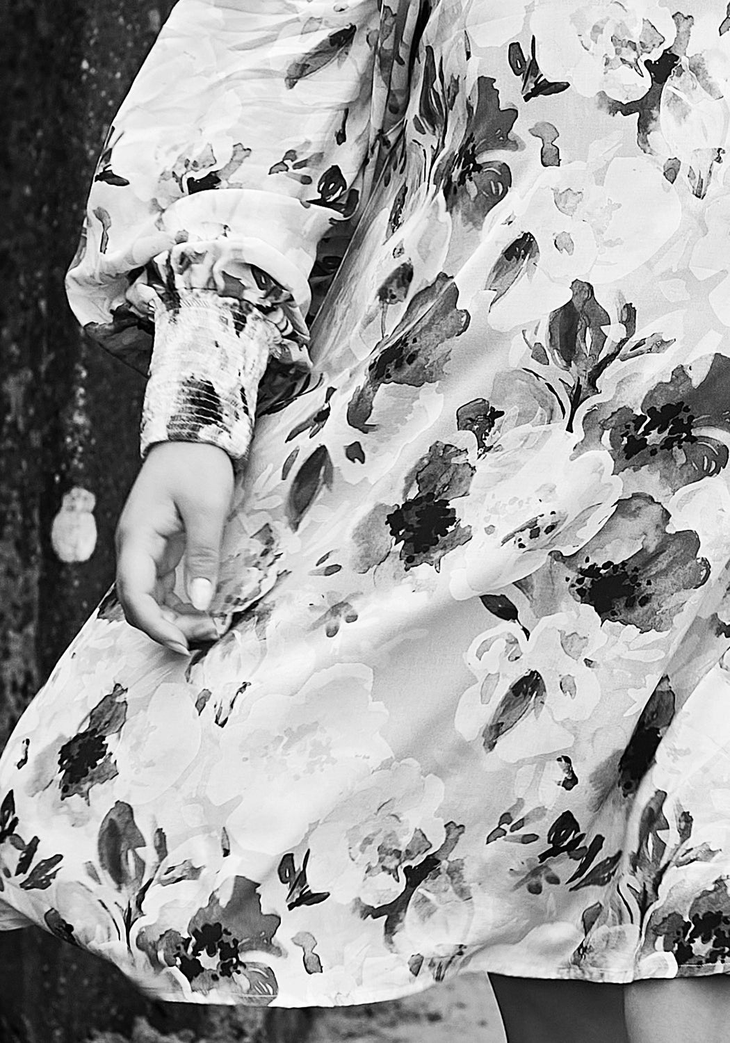 Classic design elements, such as the voluminous sleeves and elegant smocking at the wrists, make this long-sleeved blouse the perfect choice for both office days and parties. The stylish stand-up collar is decorated with beautiful covered buttons and a slit at the back. The Blue Anemone pattern combines a luxurious blue base color with large, watercolor-like floral patterns to create a timeless and elegant ensemble.