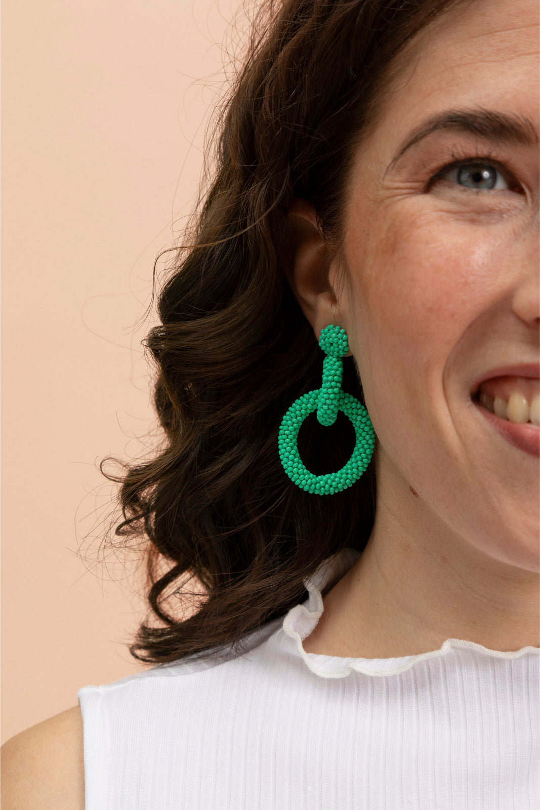 Gia earrings are striking and playful earrings handcrafted in Nepal, assembled from small glass beads. Despite their size, these super popular earrings are lightweight.