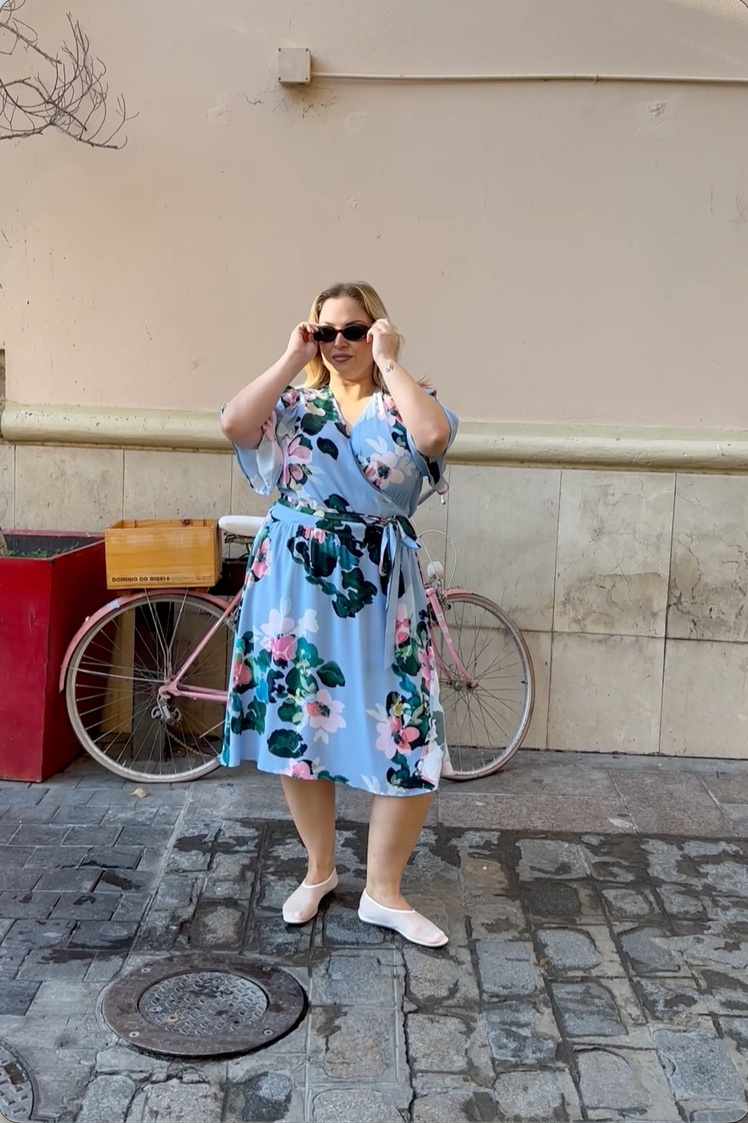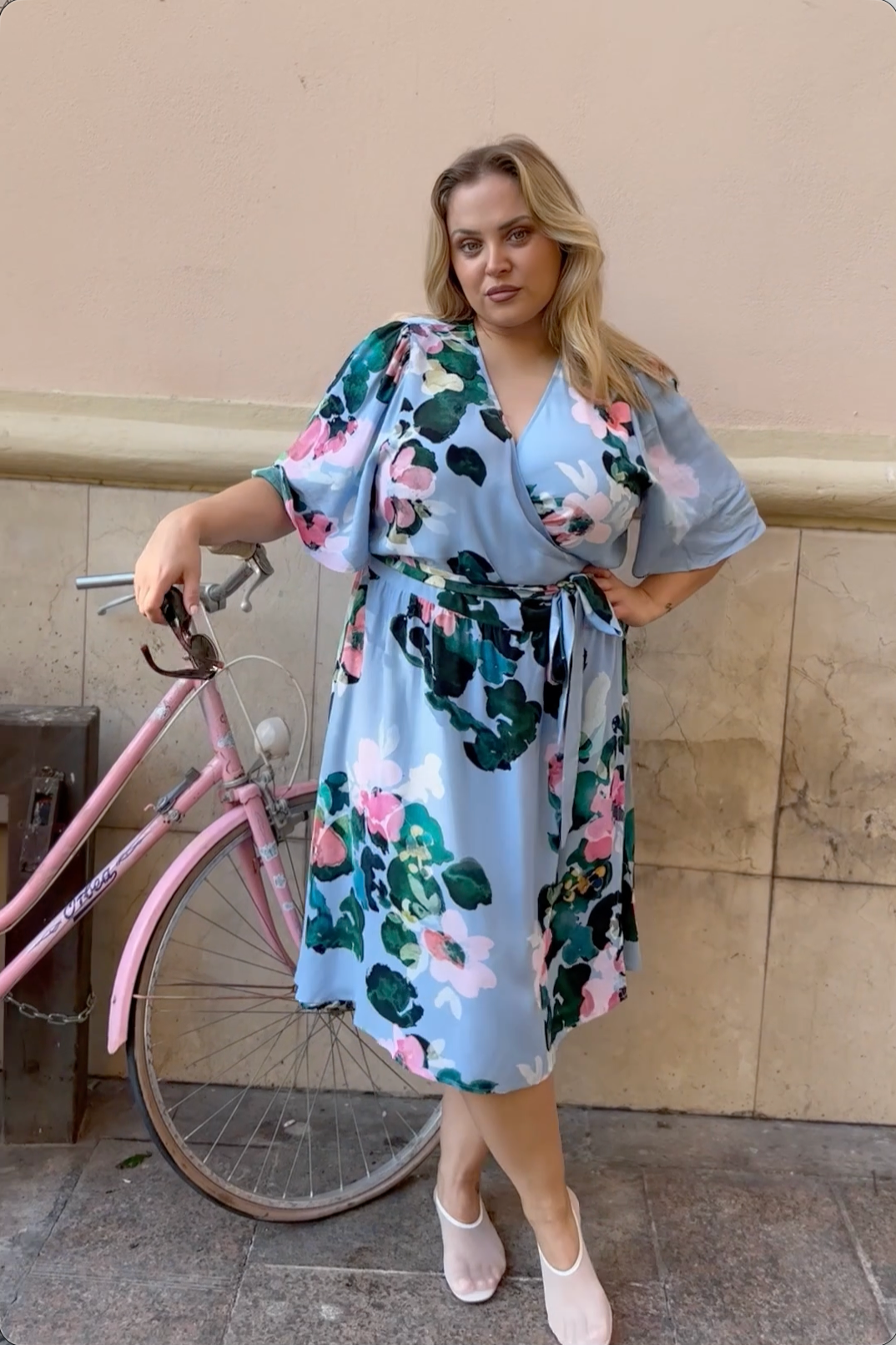 The flattering wrap cut and adjustable waistband ensure a good fit for different body types. The dress has loose, bell sleeves, and the shoulder pleats create a straight silhouette. The hem of the dress is approximately knee-length. The pattern is Water Lily with a light blue base.
