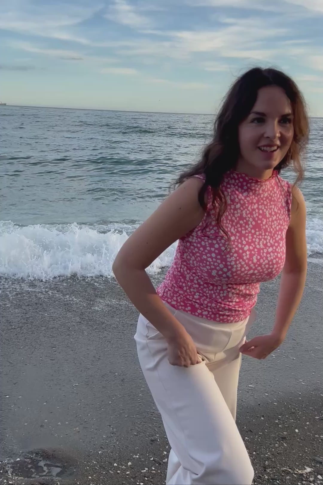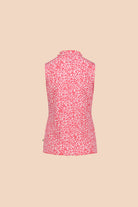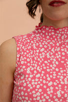 This high-quality women's top has a fitted cut and an elegant turtleneck. The neckline and hem are finished with stylish rolled hems. The top features the Flora Pink pattern.
