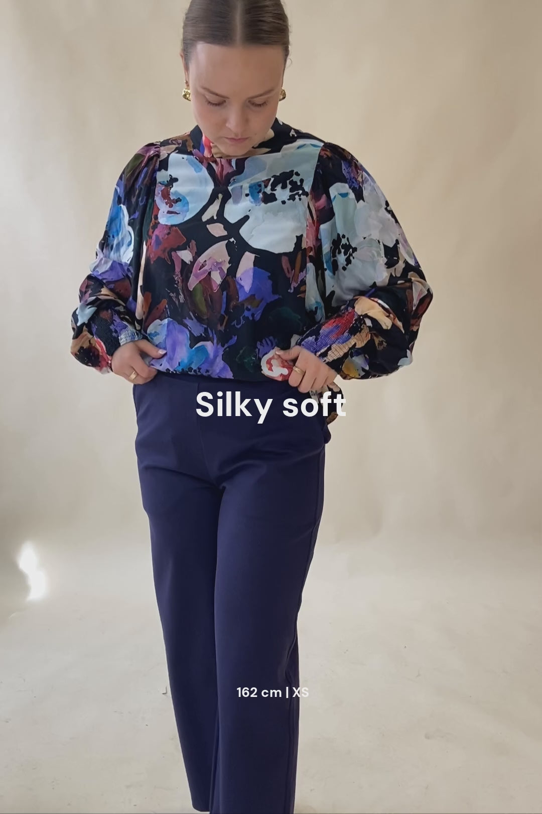 The elegant Puff Blouse is made of beautifully draped woven EcoVero™ viscose with a silky and soft feel. The Puff Blouse has large voluminous sleeves, and the cuffs are decorated with a beautiful smock ruching. The stand-up collar has stylish coated buttons and a small slit on the back. Loved as a pattern, Black Anemone, where large watercolor flowers sprawl on a black background.