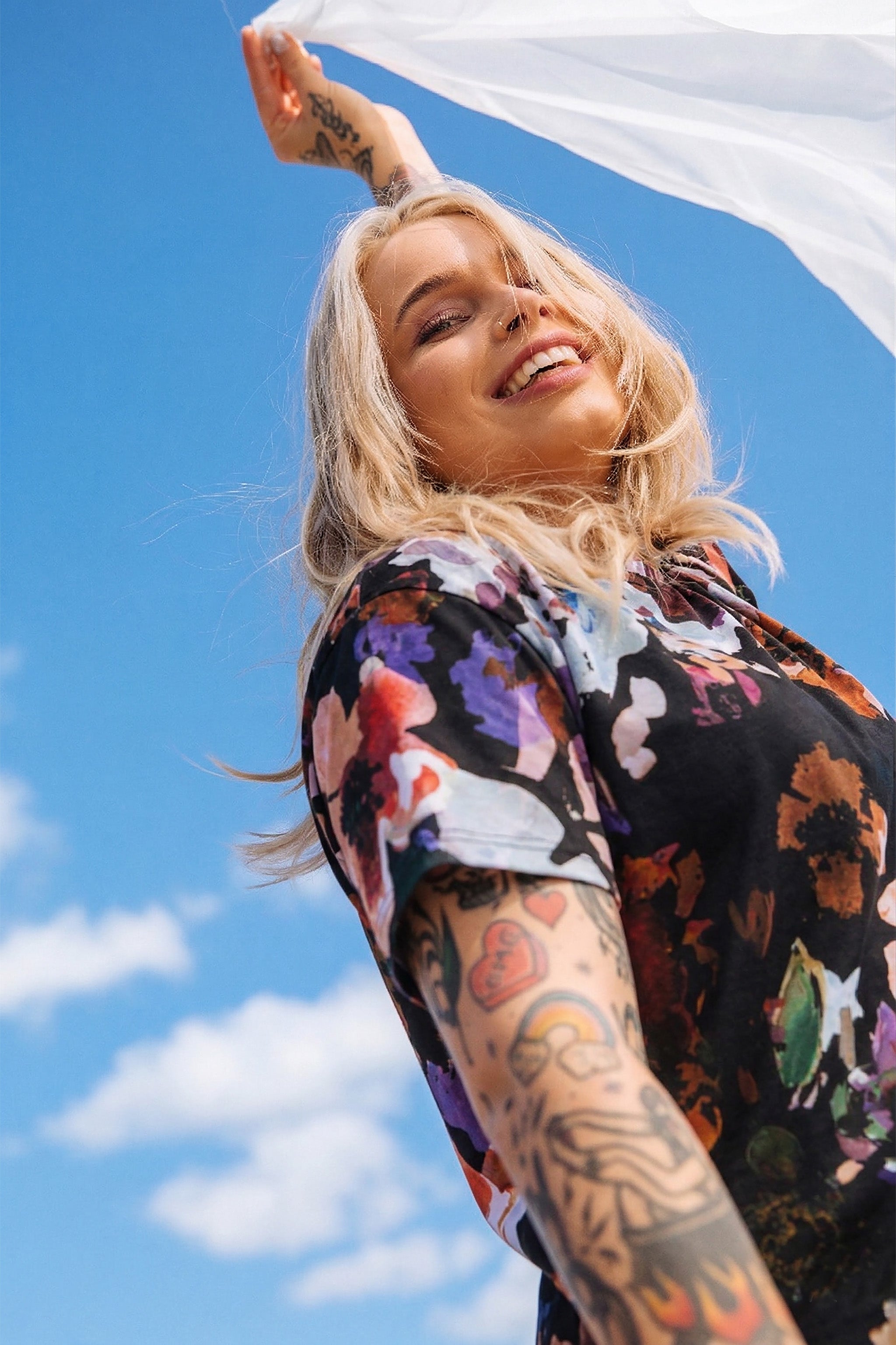 This high-quality women's t-shirt is made of soft organic cotton that feels comfortable to wear. The classic t-shirt has a relaxed fit and can be easily combined with your favorite jeans, skirts, or shorts. The pattern is the beloved Black Anemone.