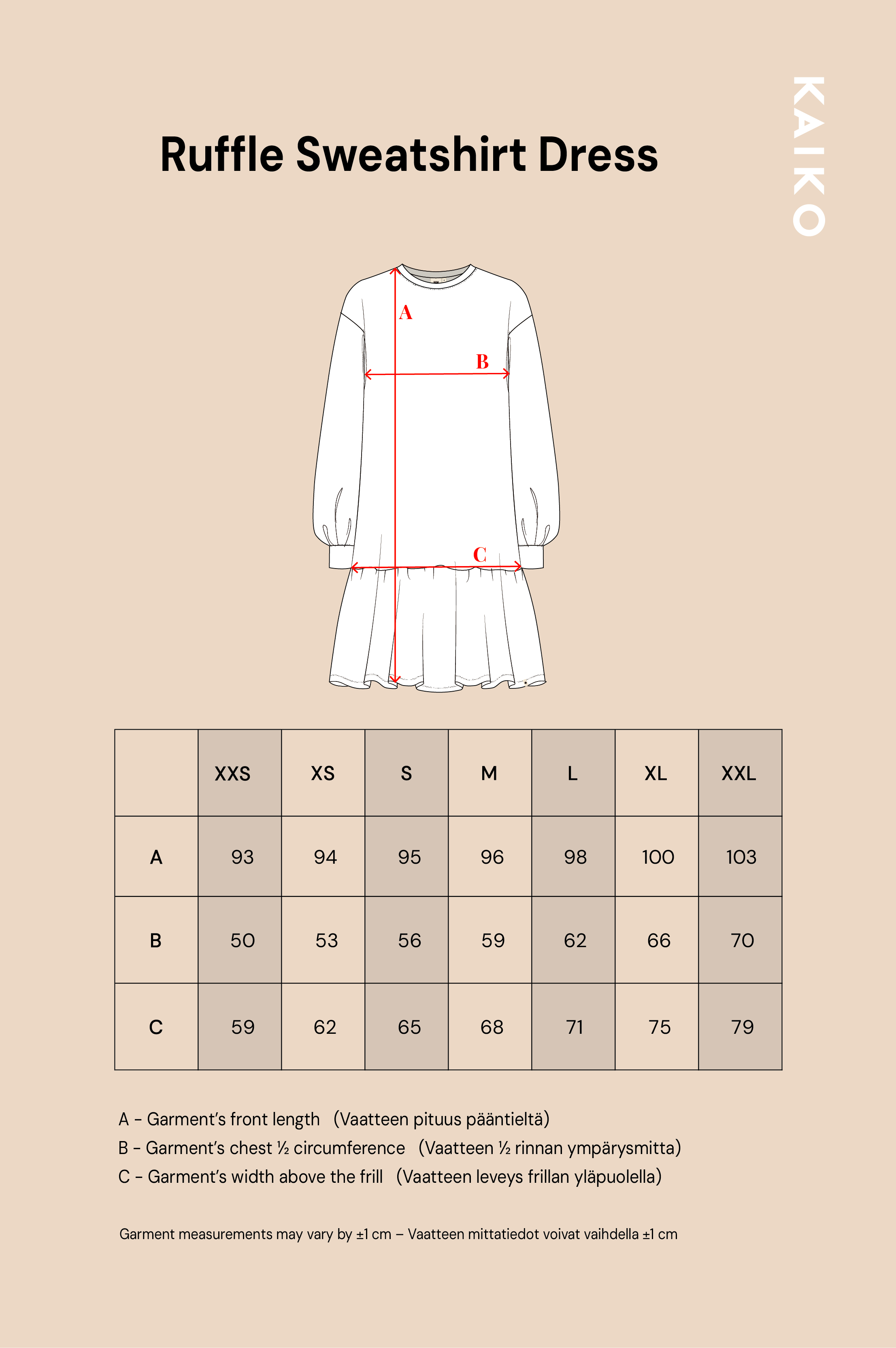 The Ruffle Sweatshirt Dress is loose and oversized. If you prefer a more fitted fit, we recommend choosing a size smaller than you would normally choose. Use the body measurement chart and garment measurements (last picture) to help you choose your size.