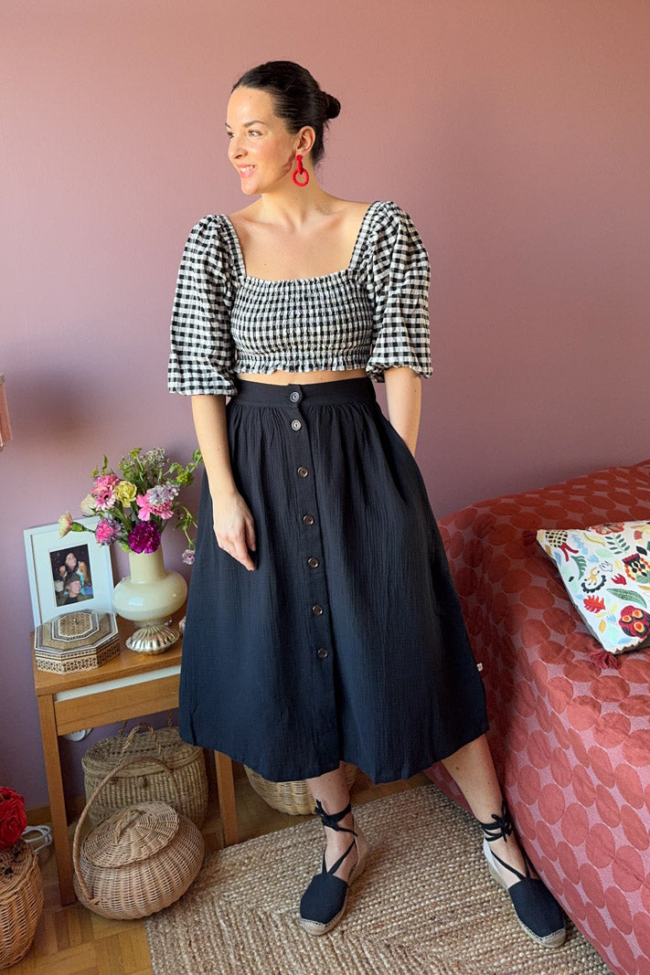 The casually stylish Button Skirt is made of woven organic cotton muslin fabric. The beautifully flowing midi-length skirt is decorated with a row of buttons. Elastic band at the back waist, which makes the skirt comfortable to wear. In addition, the skirt has pockets. As a material, muslin is wonderfully soft and breathable and an ideal material due to its easy care; it does not need to be ironed, and it can be grabbed directly from the clothesline. The shade is elegant black. Unlined.