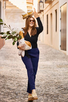 When you want cool pants that don't compromise on comfort, Comfy Slacks are a sure choice. Made from thick and stretchy ponte roma interlock knit, the pants follow the spirit of straight pants, but feel wonderfully soft on the body. The pants have a wide elastic waist (5 cm high) and front pockets. Shaped pleats at the back ensure a good fit. Denim stitching runs along the side seams, which gives the pants an extra-sharp feel. Classic dark blue color.