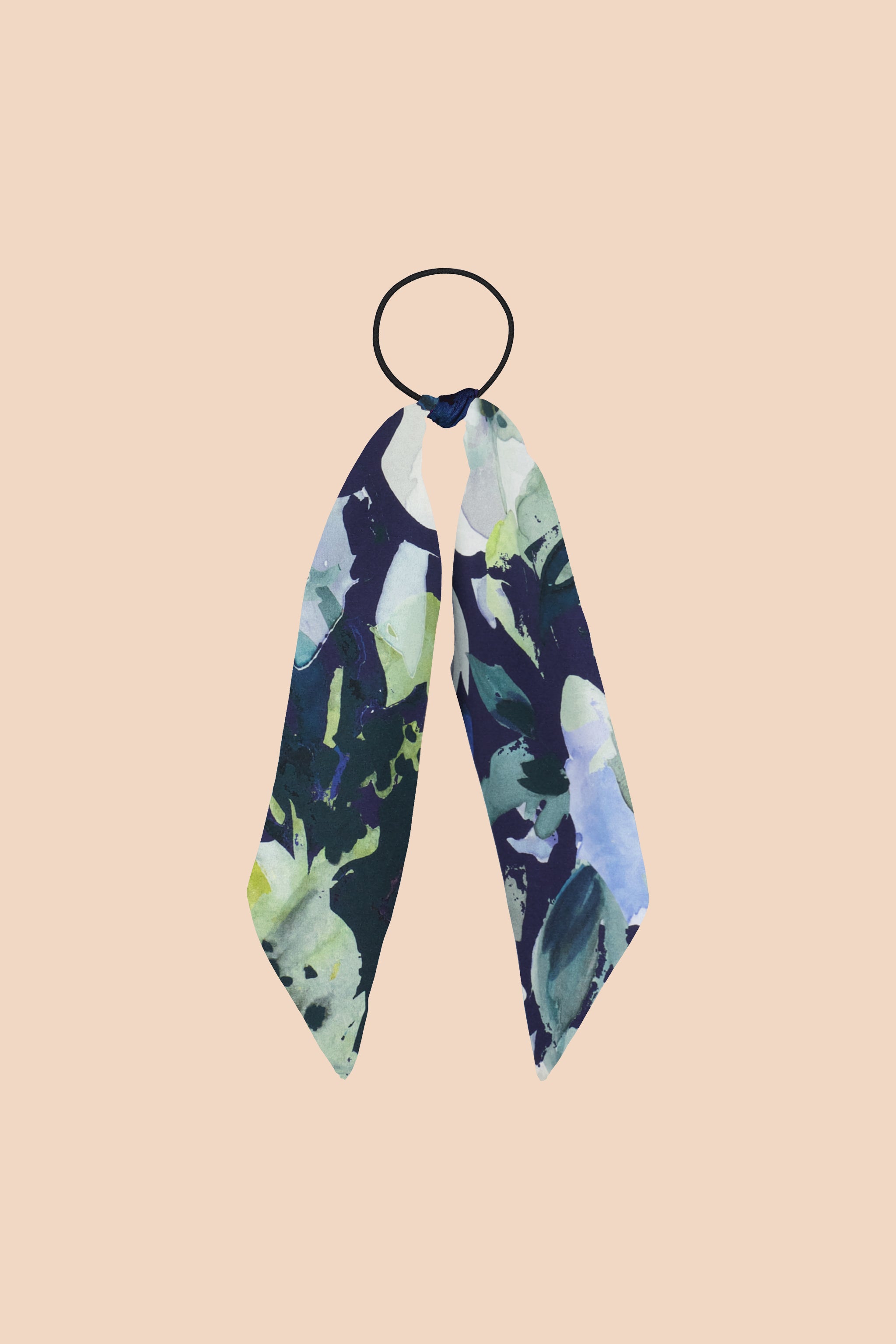 The Ponytail Scarf is in the Blue Anemone pattern. A mini scarf is tied to a black rubber hair loop, which can be removed for other hair styling purposes if desired.