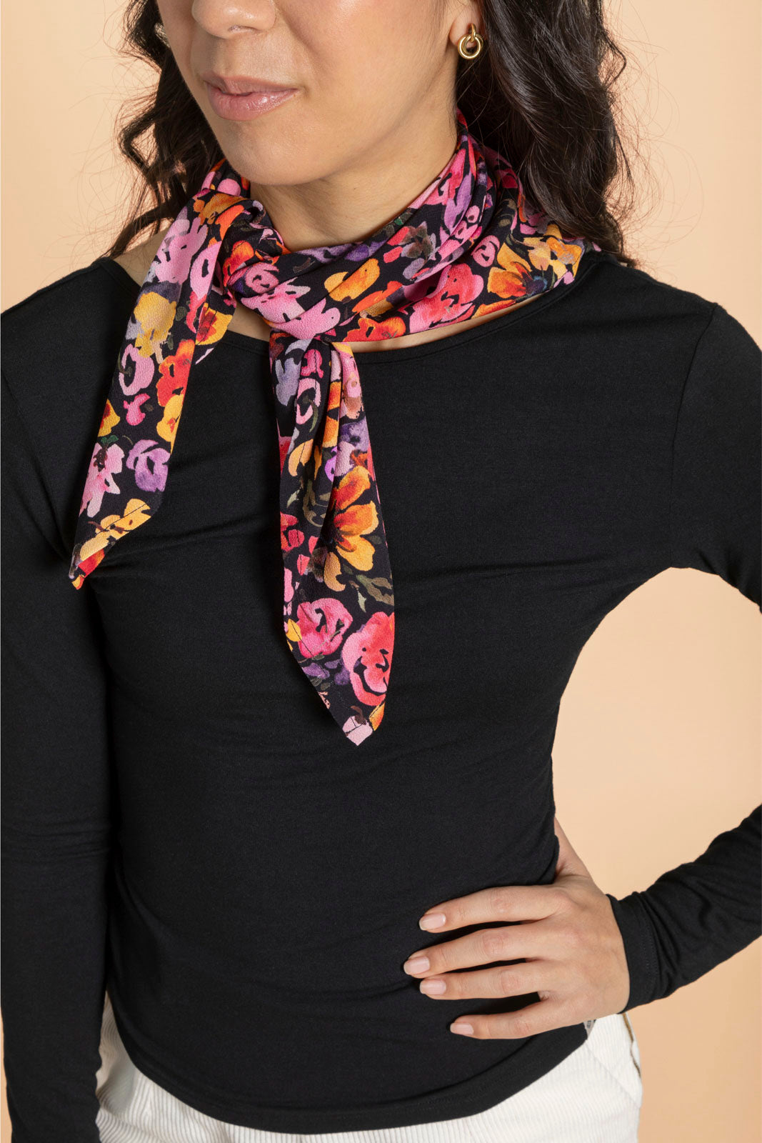 The versatile Square Scarf is the perfect finishing touch to any outfit: wrap it around your neck, in your hair, on your head, or tie it to your bag. Made from sustainable EcoVero™ viscose crepe, the edges of the scarf are finished with a narrow hem. The scarf features a black-based Wild Lea watercolor floral design.
