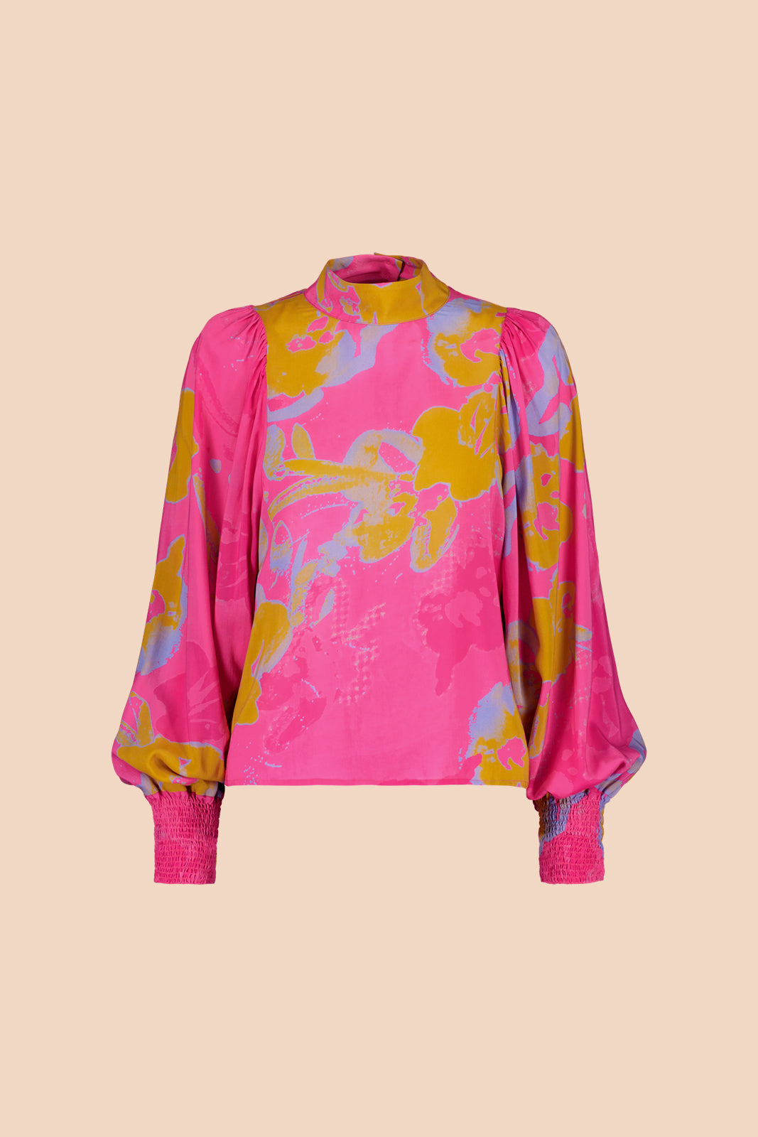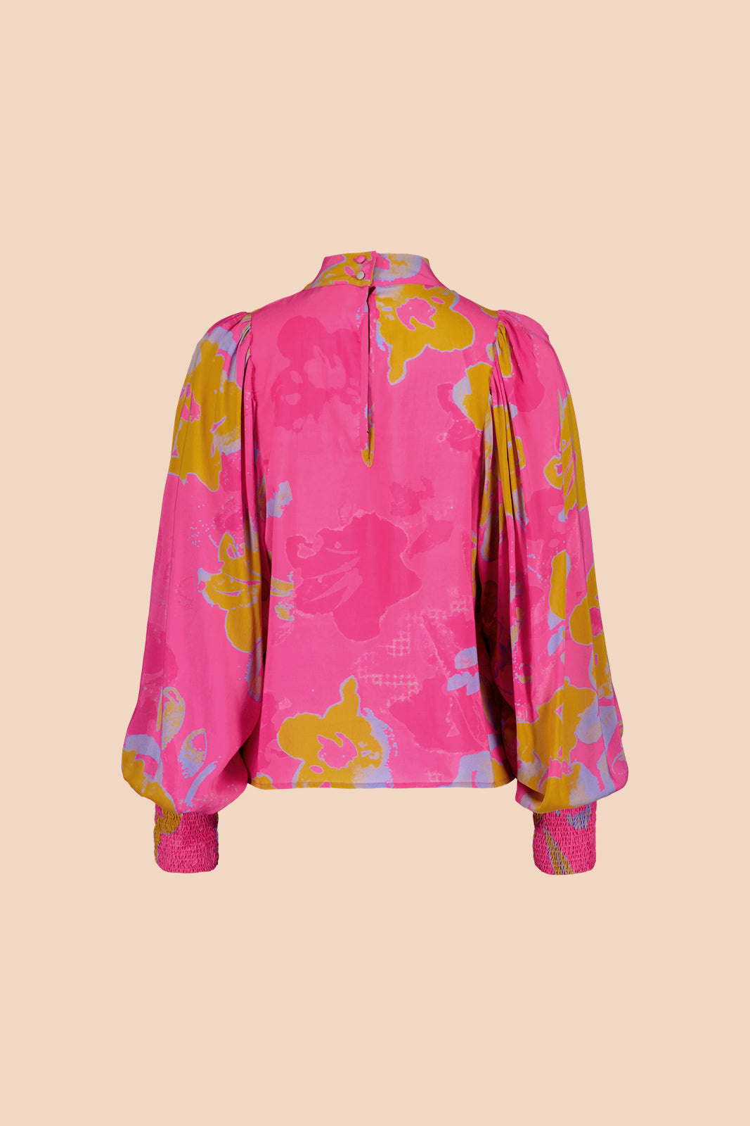 The Puff Blouse has large voluminous sleeves, and the cuffs are decorated with a beautiful smock ruching. The stand-up collar has stylish coated buttons and a small slit on the back. As a pattern, Super Pink, where large ocher-colored flowers sprawl on a pink background.