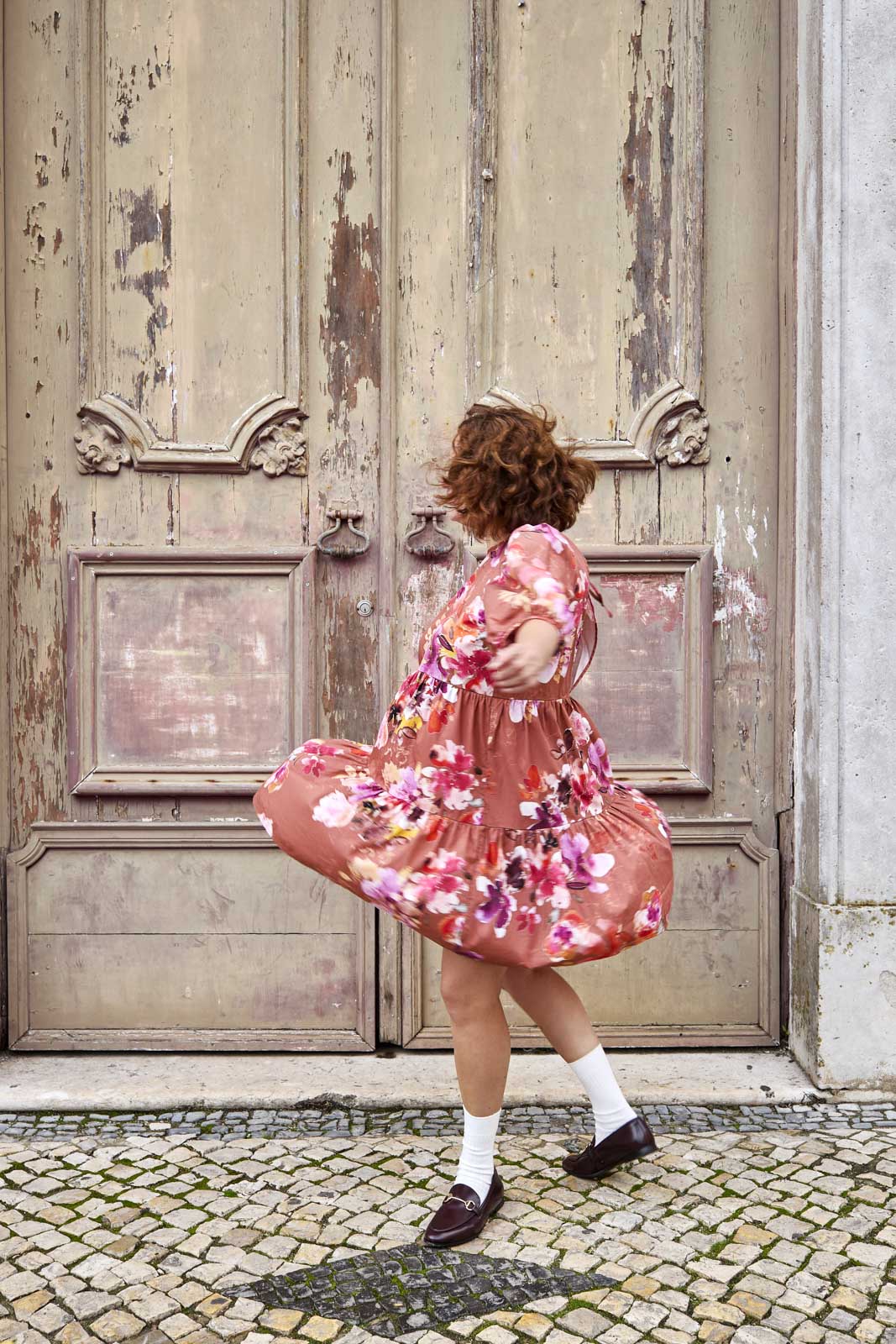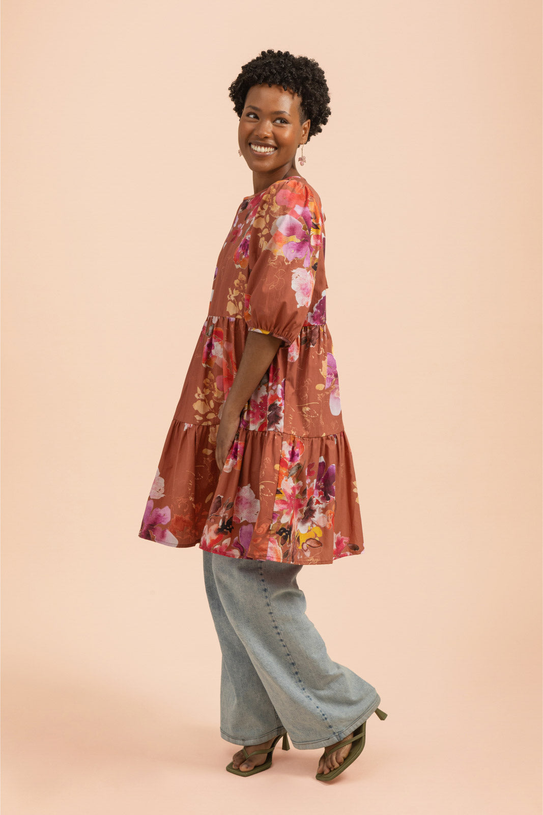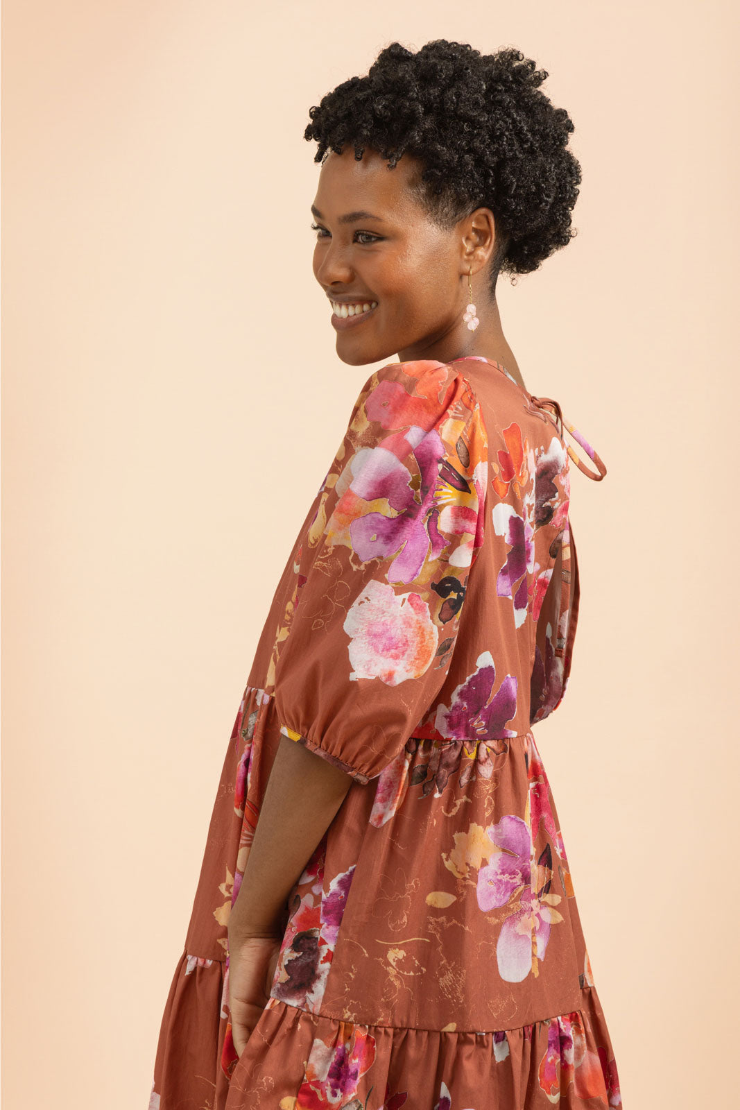 Style this high-quality women’s dress to suit your own look: pair it with heels and a clutch for an event, or go casual with sneakers or sandals for everyday wear. The Lilies floral pattern combines a reddish-brown base with large, watercolor-style floral motifs, creating a timeless and striking ensemble.