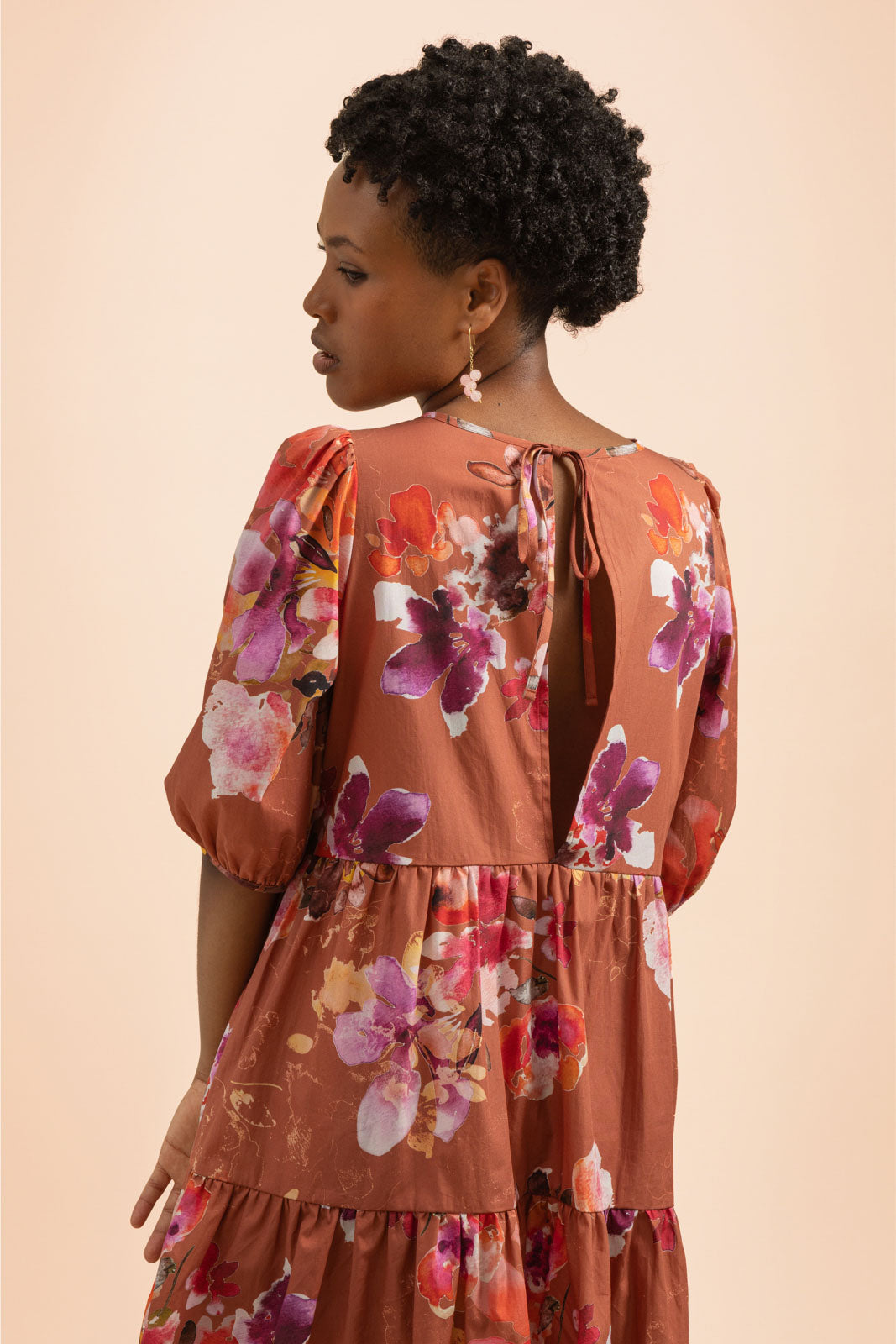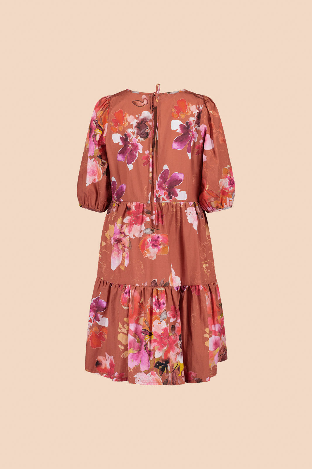 Versatile and eye-catching, this dress is perfect for both everyday wear and special occasions. The loose design features mid-length puff sleeves and a tiered, mini-length hem. A tie closure at the neck and a deep slit extending to the waistline in the center back seam add a polished finishing touch to the dress.