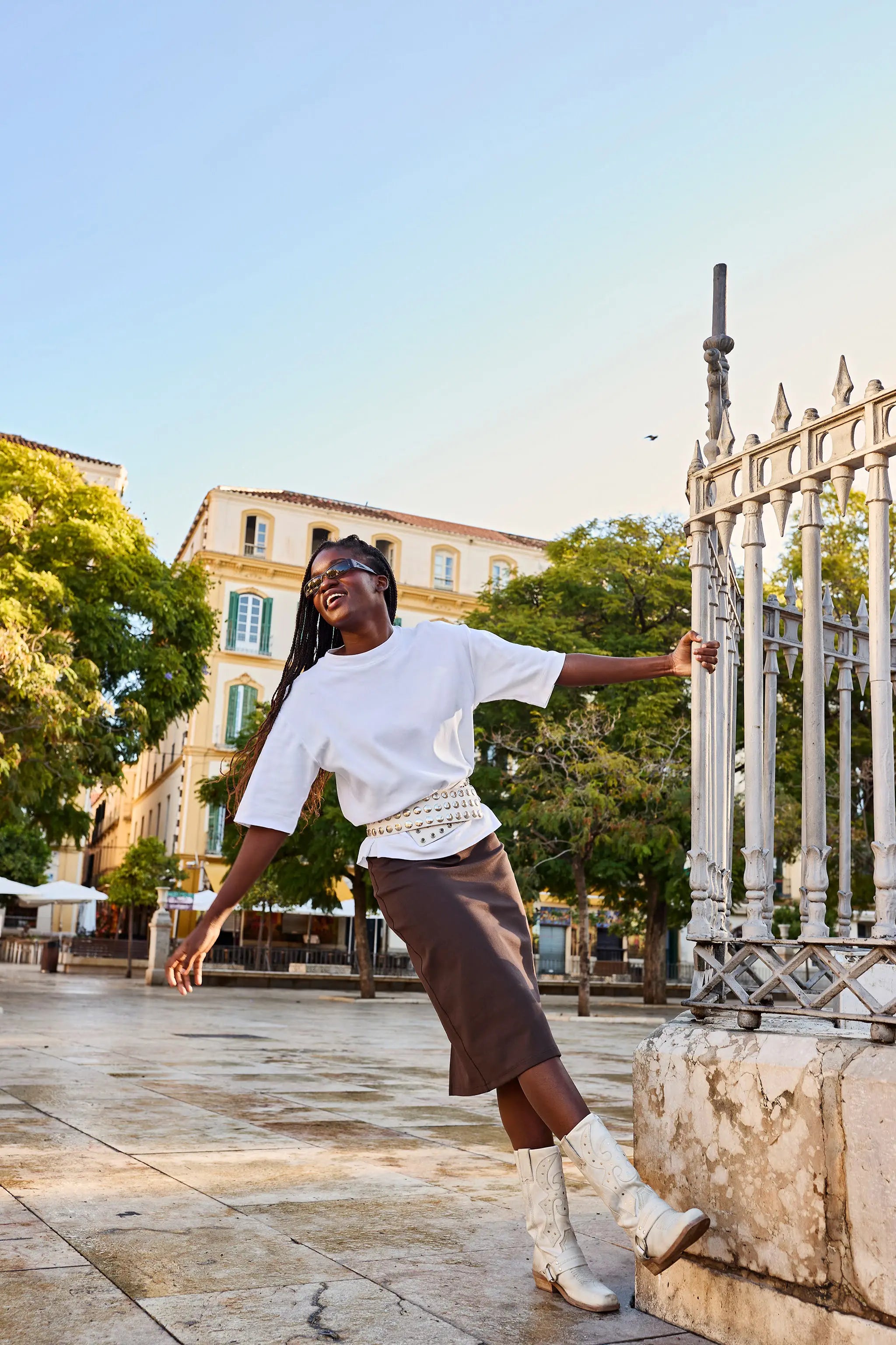 The skirt has a wide (5 cm high) hidden elastic waistband that looks cool even inside a shirt hem. There is a 20 cm slit in the center back. Denim stitching runs along the side seams. The skirt has a classic above-the-knee hem length.