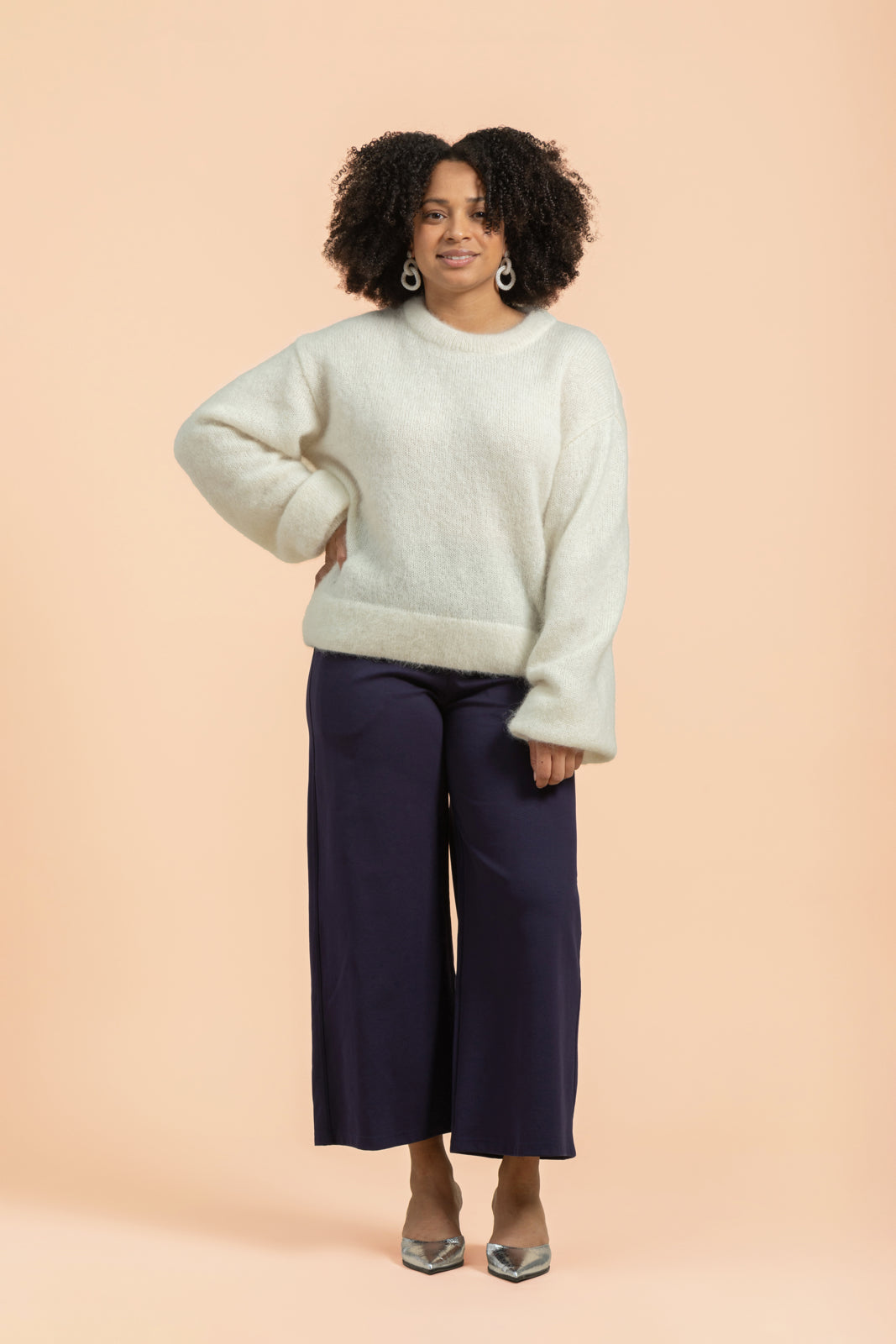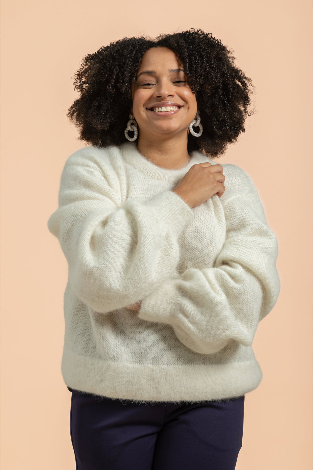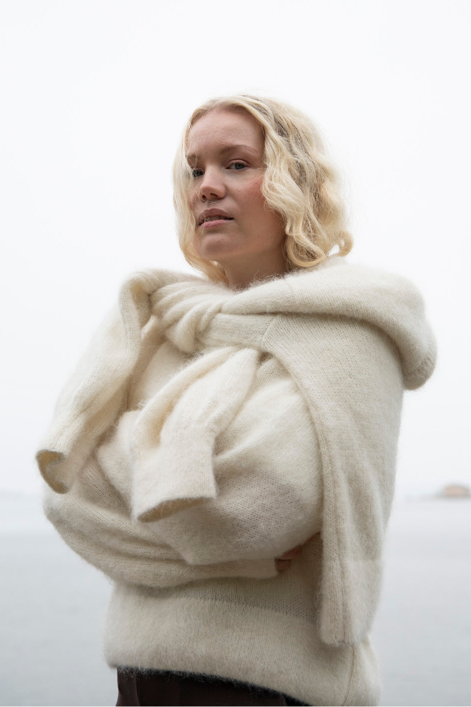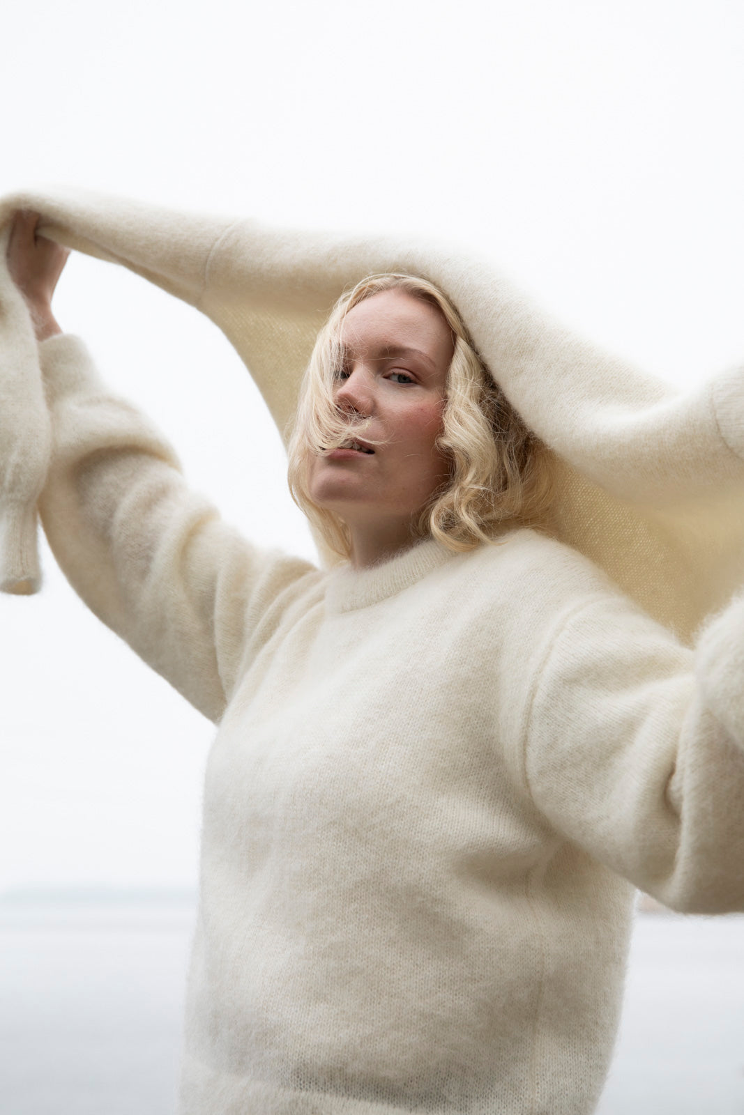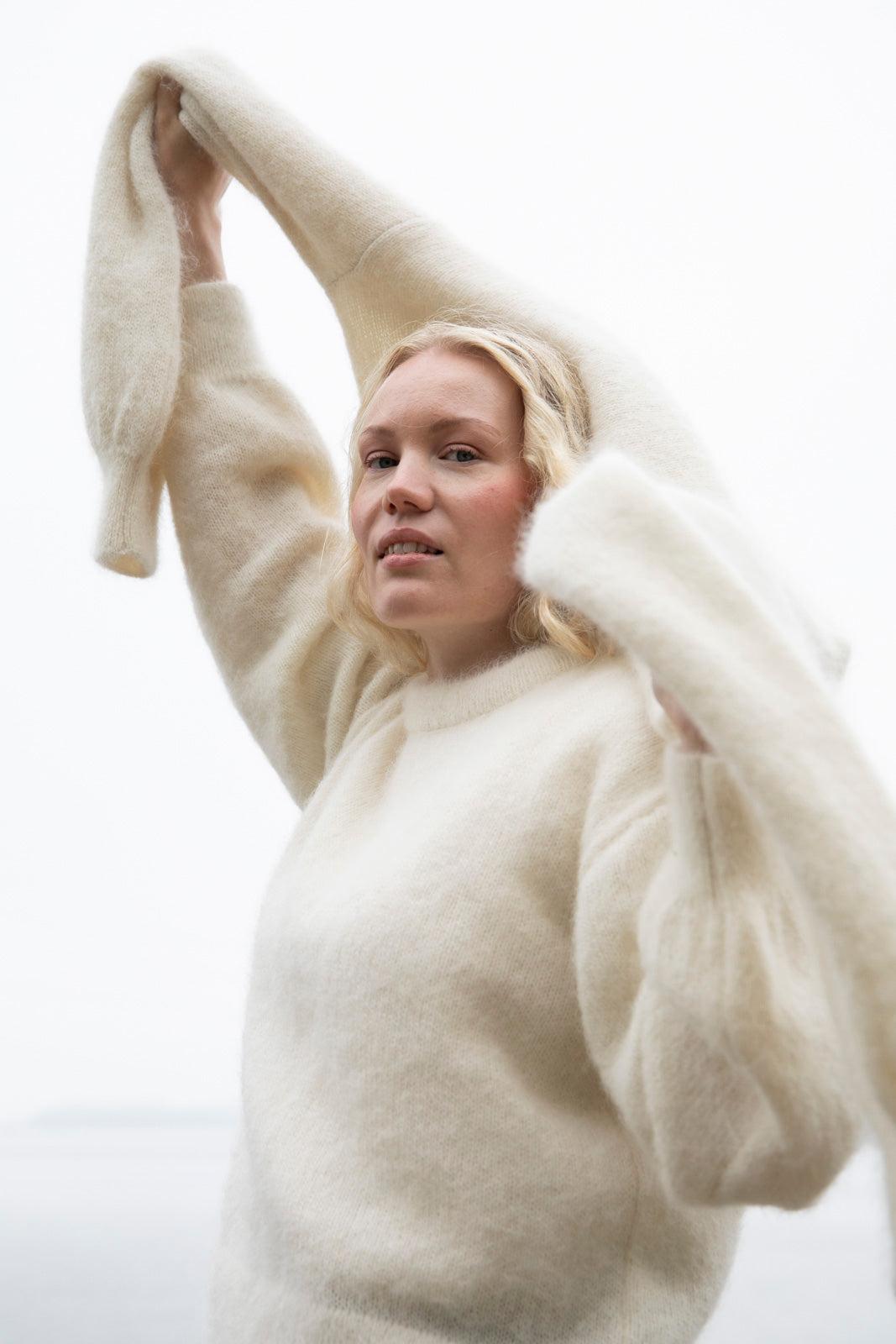 The timeless Alpaca Mohair Jumper has a relaxed silhouette, dropped shoulders, loose sleeves, and ribbing at the cuffs, hem, and neckline. The versatile sweater easily transforms into different outfits – from skirts to jeans to neat trousers. The responsibly produced sweater also creates beautiful layers when worn over a dress, for example, making it a perfect choice for both everyday life and celebrations. The color of the sweater is off-white.