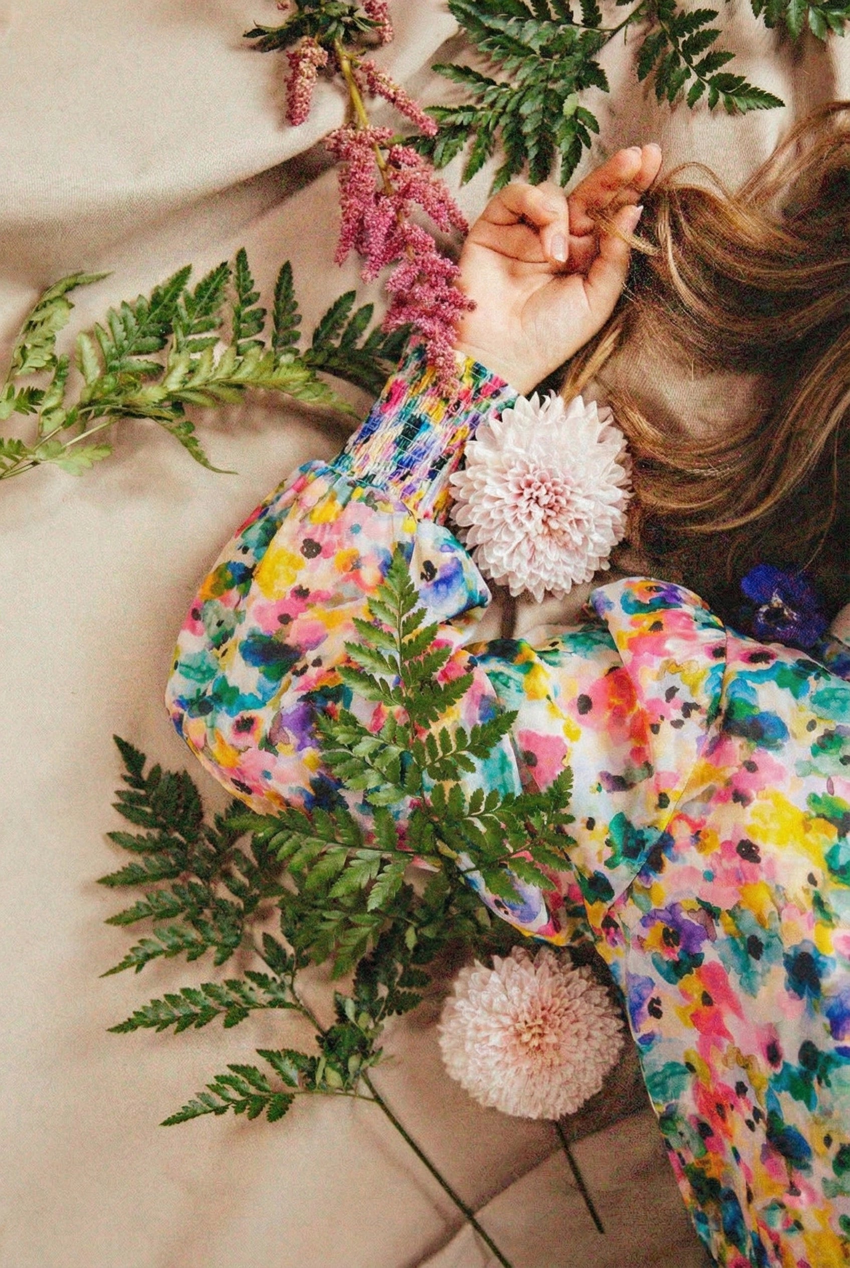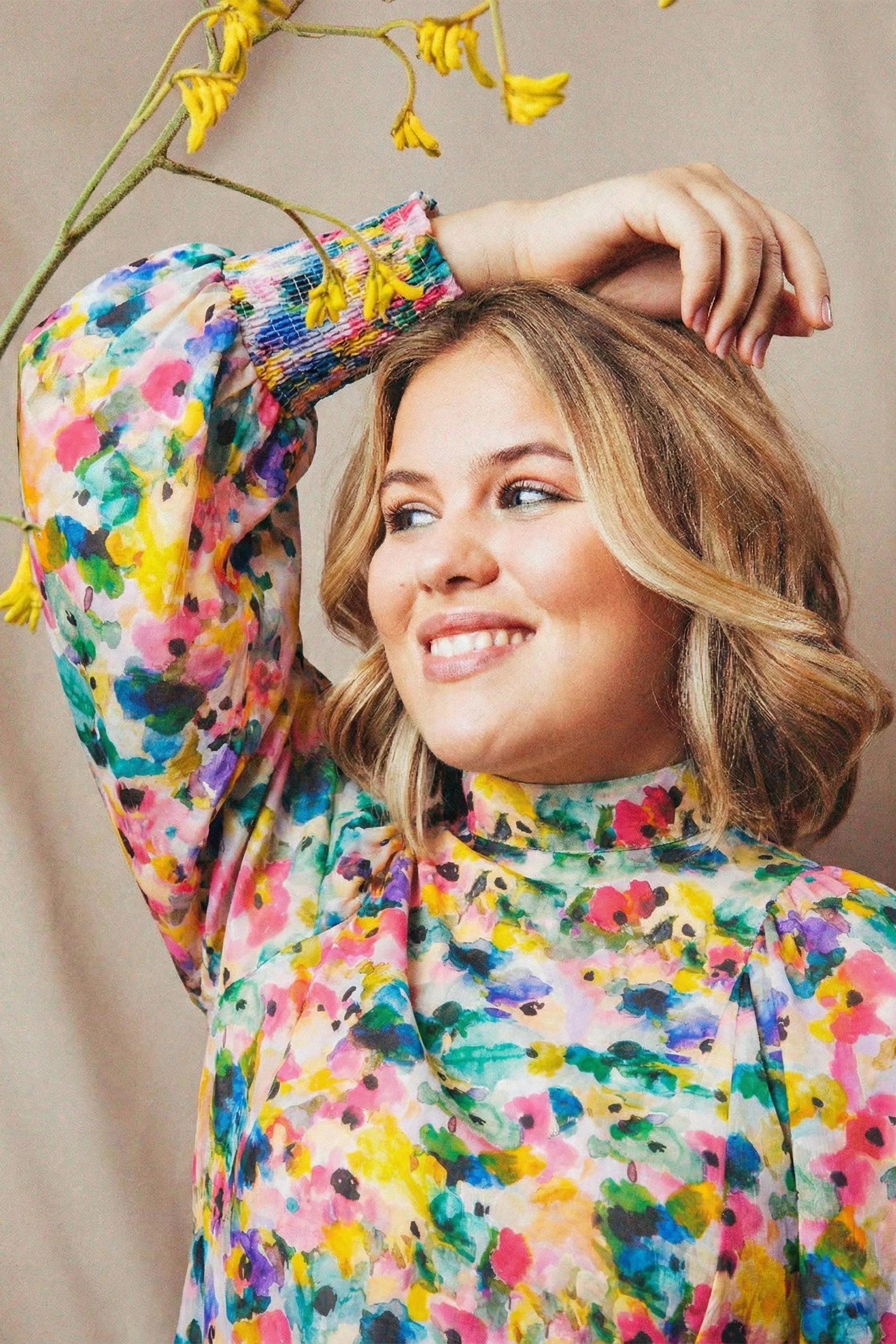Classic design elements, such as the voluminous sleeves and elegant smocking at the wrists, make this long-sleeved blouse a perfect choice for both office days and parties. The stylish stand-up collar is decorated with beautiful covered buttons and a slit at the back. The shirt features the colorful watercolor Aquarella Bloom pattern.
