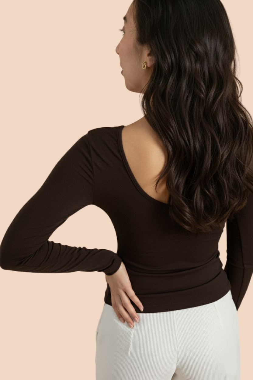 The Scoop Back Top is a long-sleeved, fitted women's shirt with a scoop neckline on the back. The shirt can also be worn the other way around, where the scoop neckline highlights your cleavage. The classic shirt comes in a delicious brown color.
