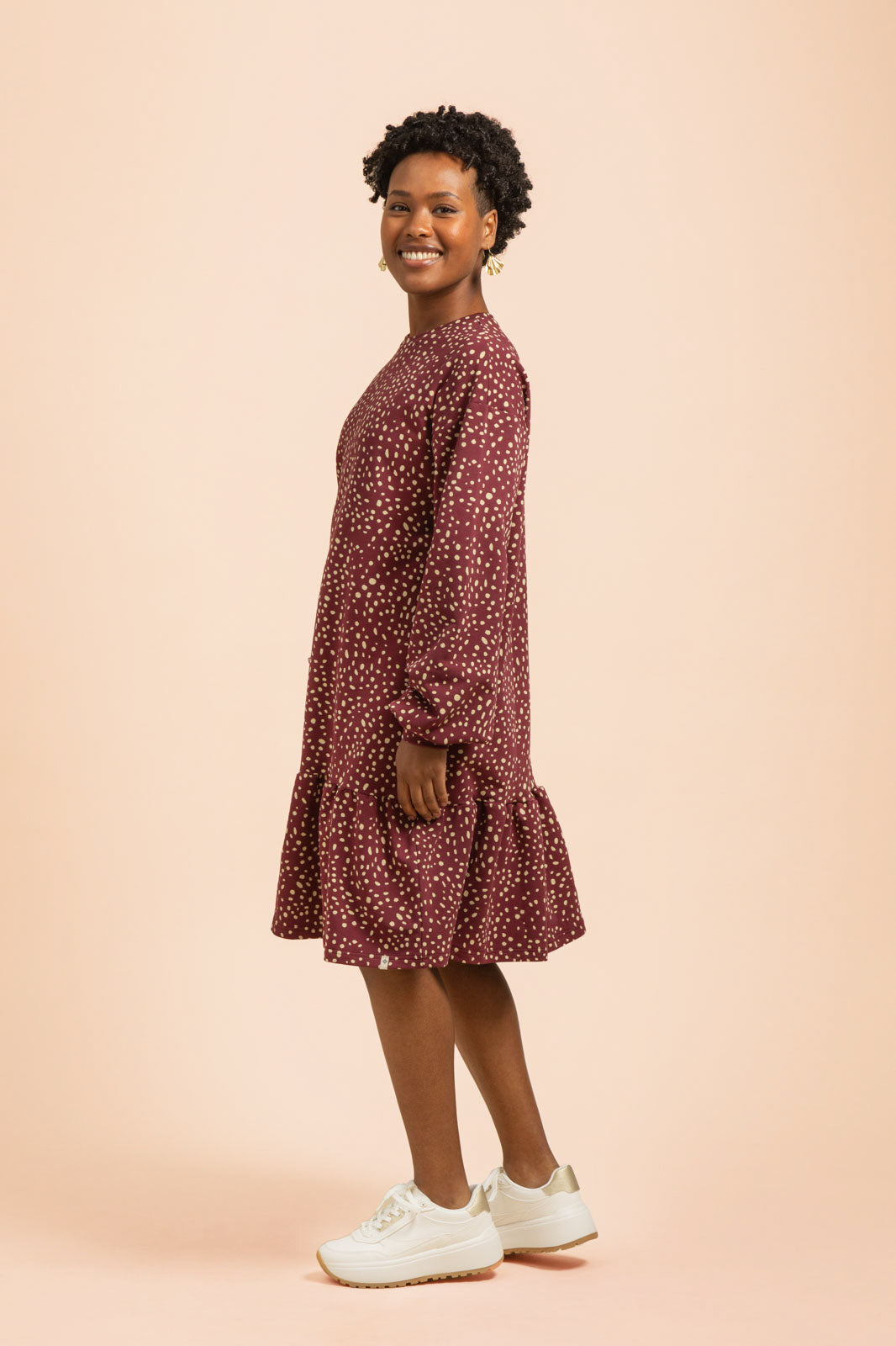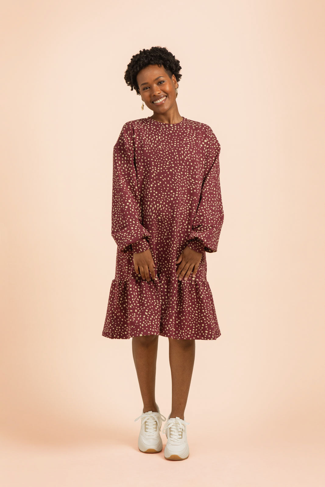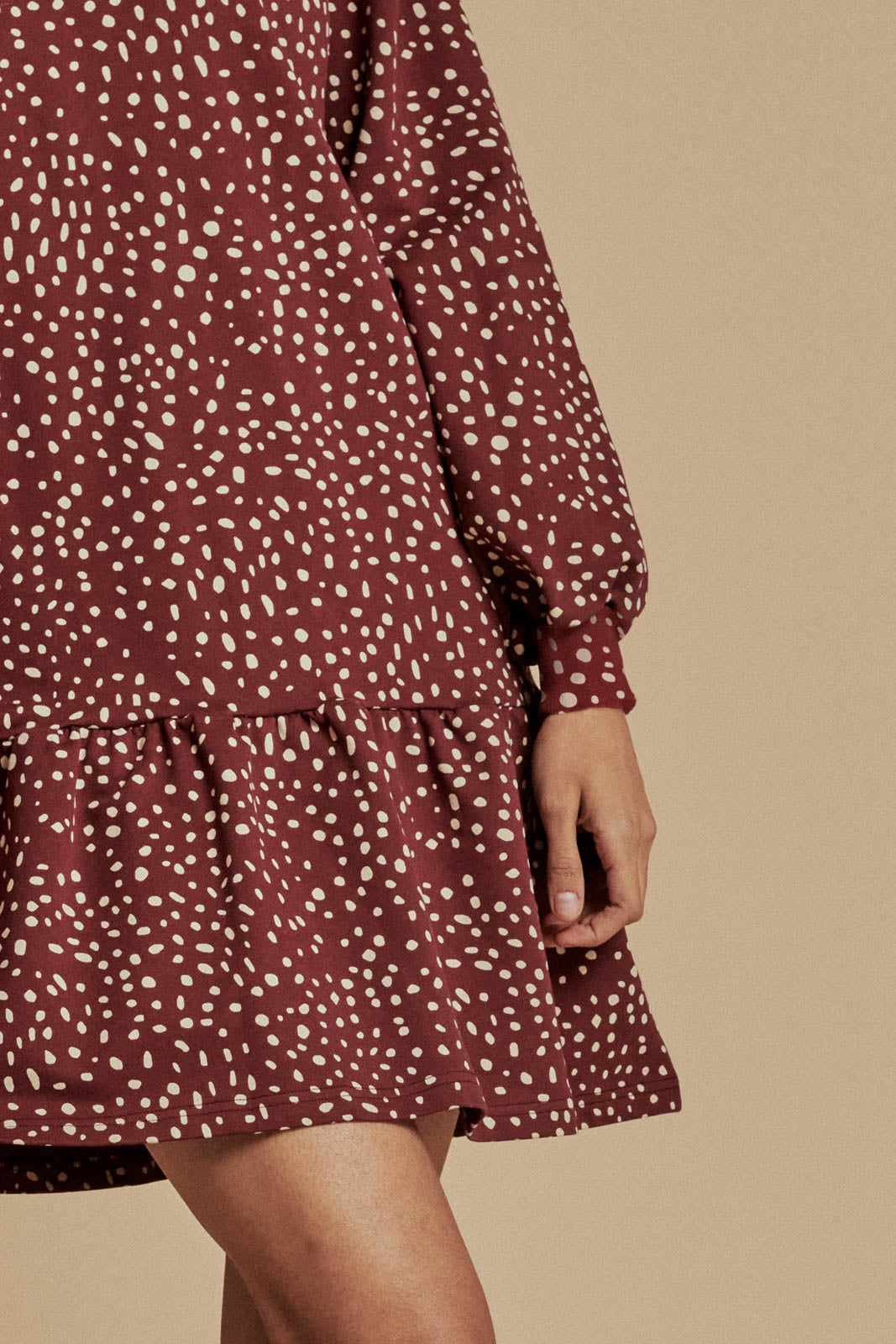 The Ruffle Sweatshirt Dress is made of wonderfully soft organic cotton stretch sweatshirt. The college dress has a loose oversize fit, short hem length, dropped shoulder line, long sleeves and a playful frill adorns the hem. In the pattern Wild Dots Burgundy, where sand-colored dots wave on a burgundy background.