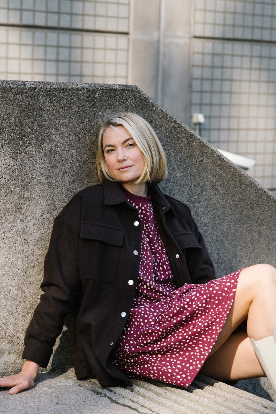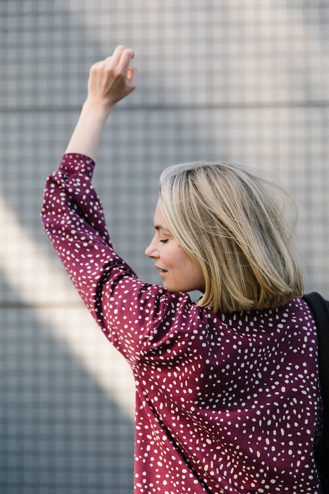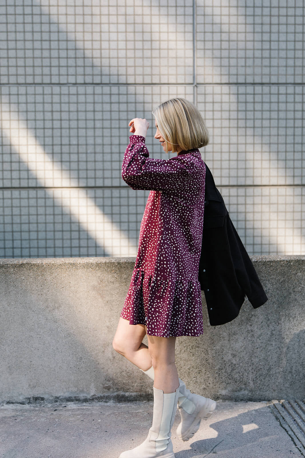 The Ruffle Sweatshirt Dress is made of wonderfully soft organic cotton stretch sweatshirt. The college dress has a loose oversize fit, short hem length, dropped shoulder line, long sleeves and a playful frill adorns the hem. In the pattern Wild Dots Burgundy, where sand-colored dots wave on a burgundy background.