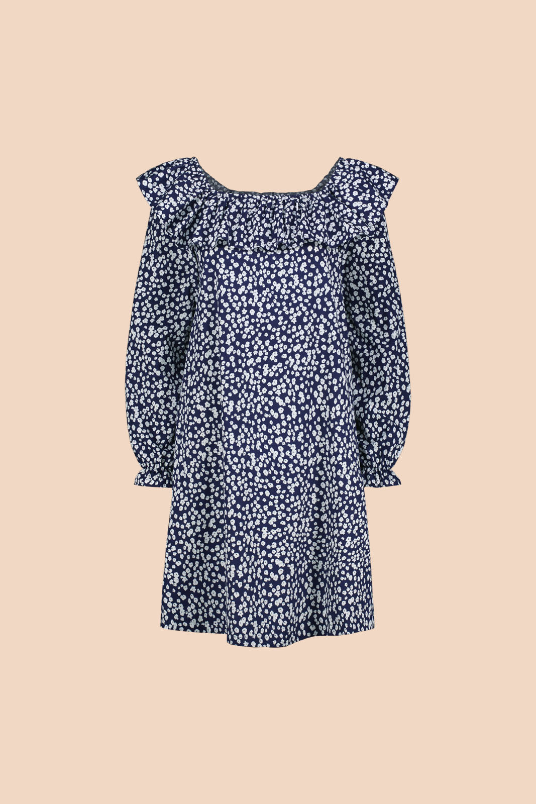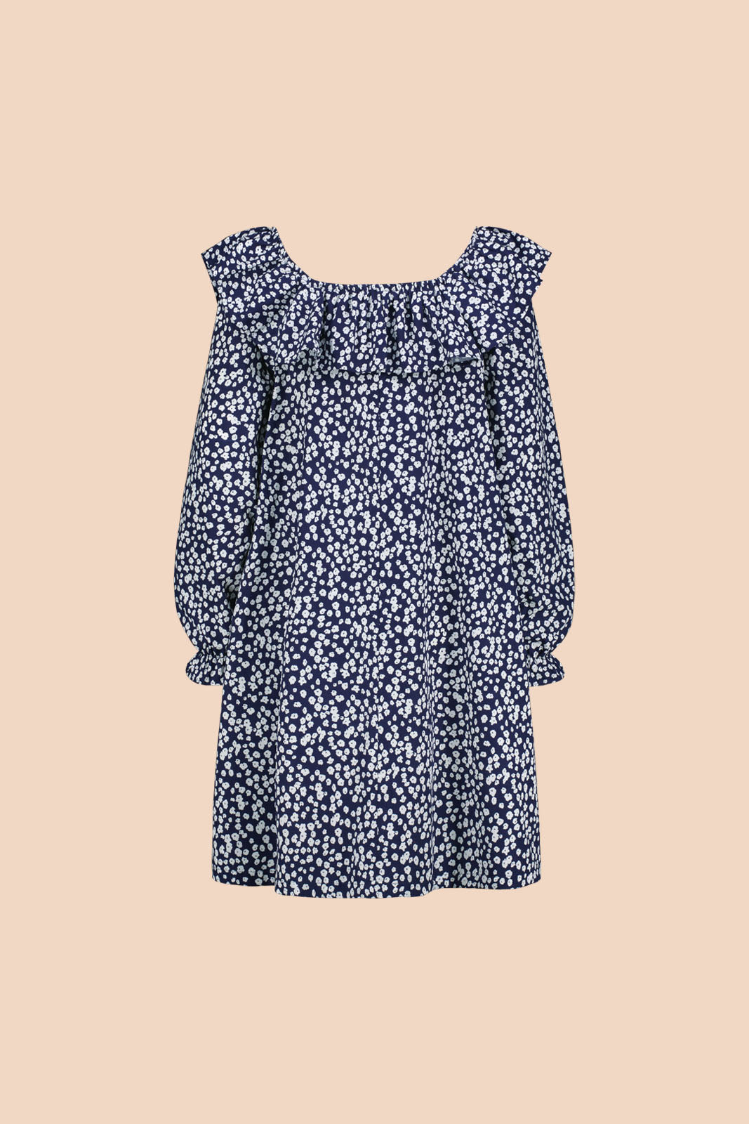The loose A-line dress has a square neckline surrounded by a frill. The neckline is gathered with an elastic band, so the dress can also be worn off-shoulder. The dress has full-length sleeves, and the cuffs have small frills. The sleeves can be pulled up to the forearms if desired, depending on your style and comfort. The generous A-line hem gives the dress airiness, and there are practical pockets in the side seams. The pattern is Flora Navy with a dark blue base.