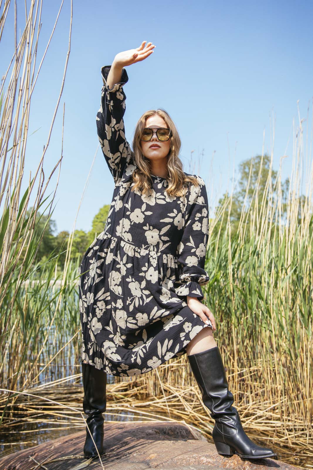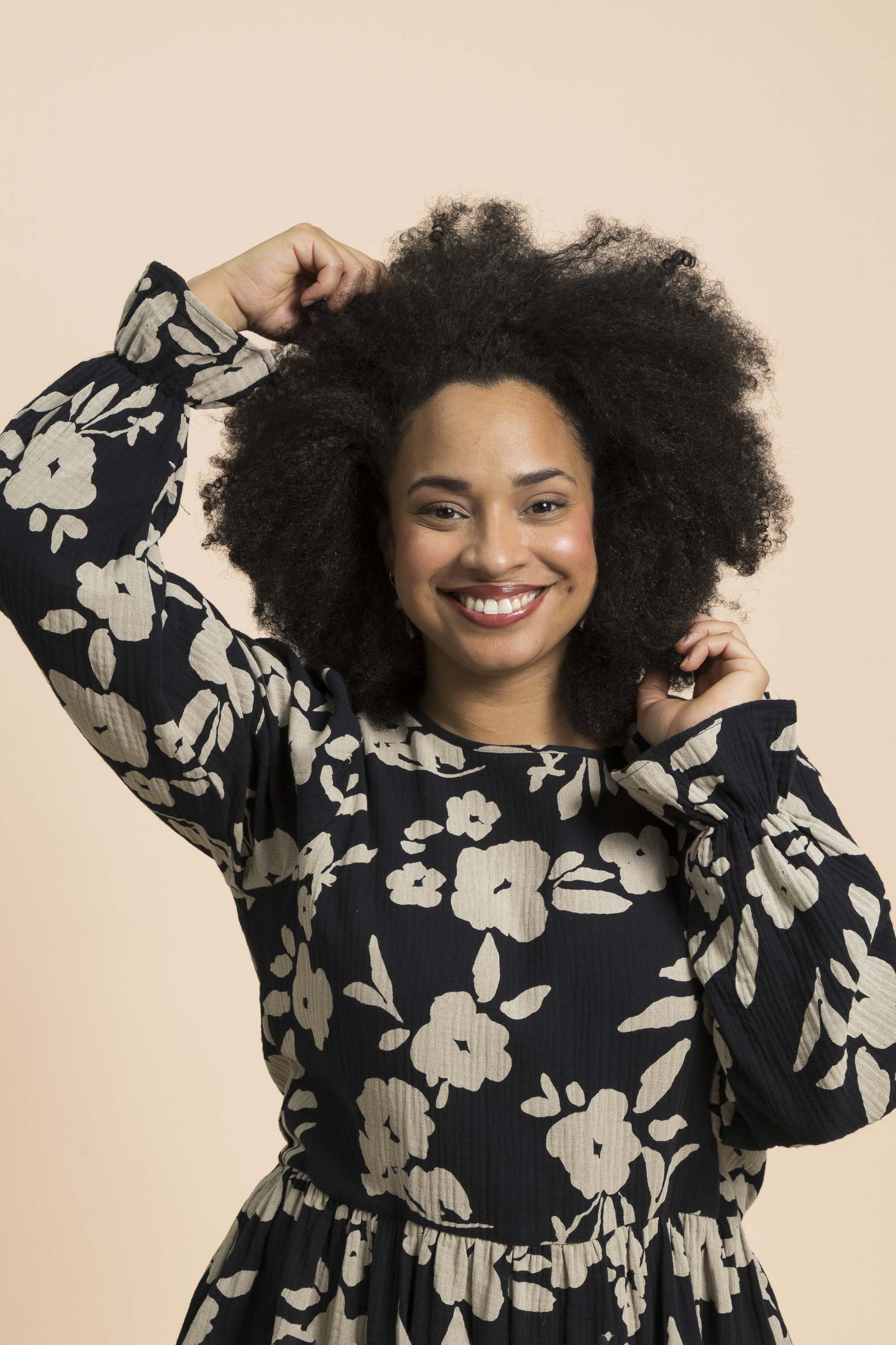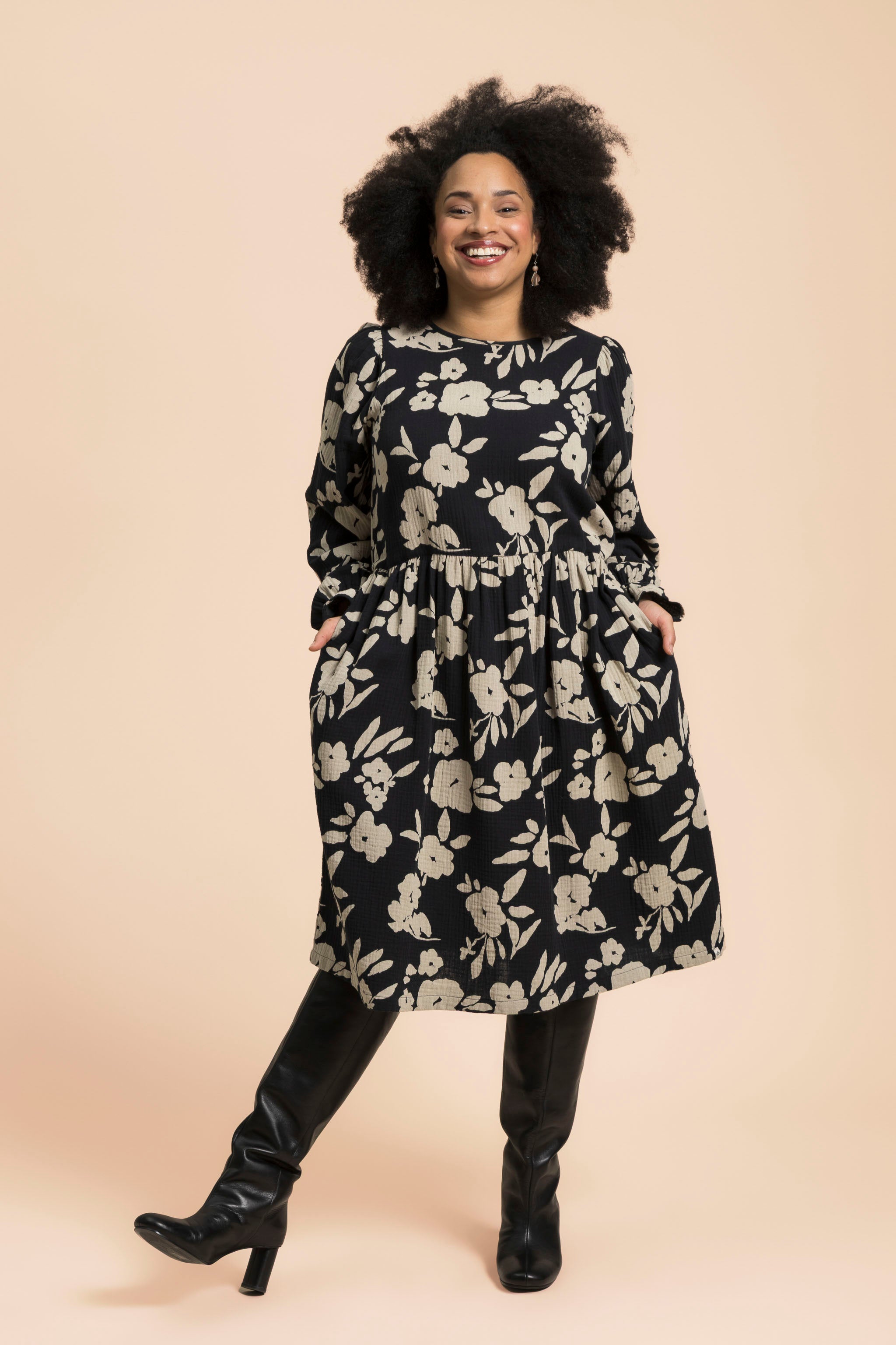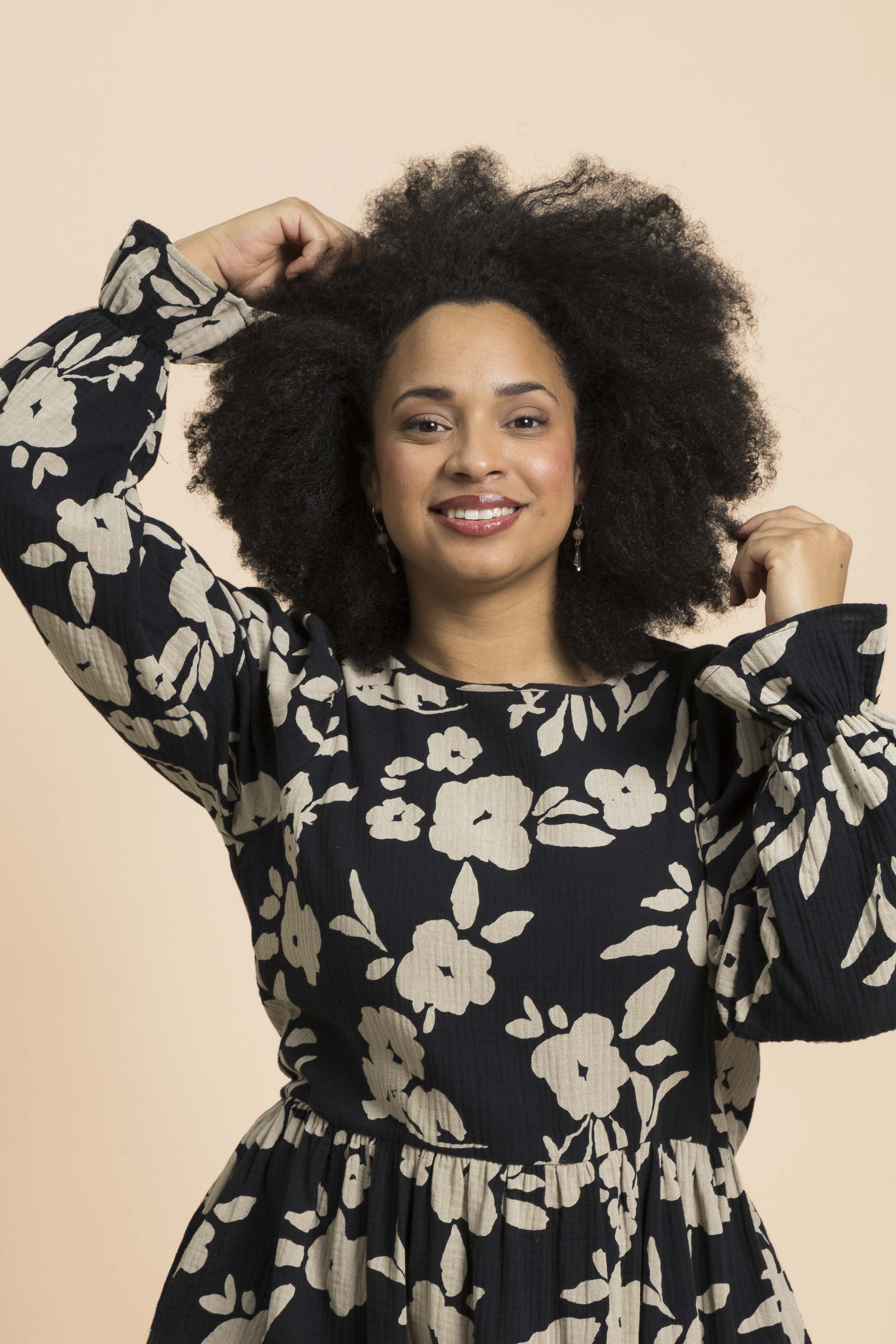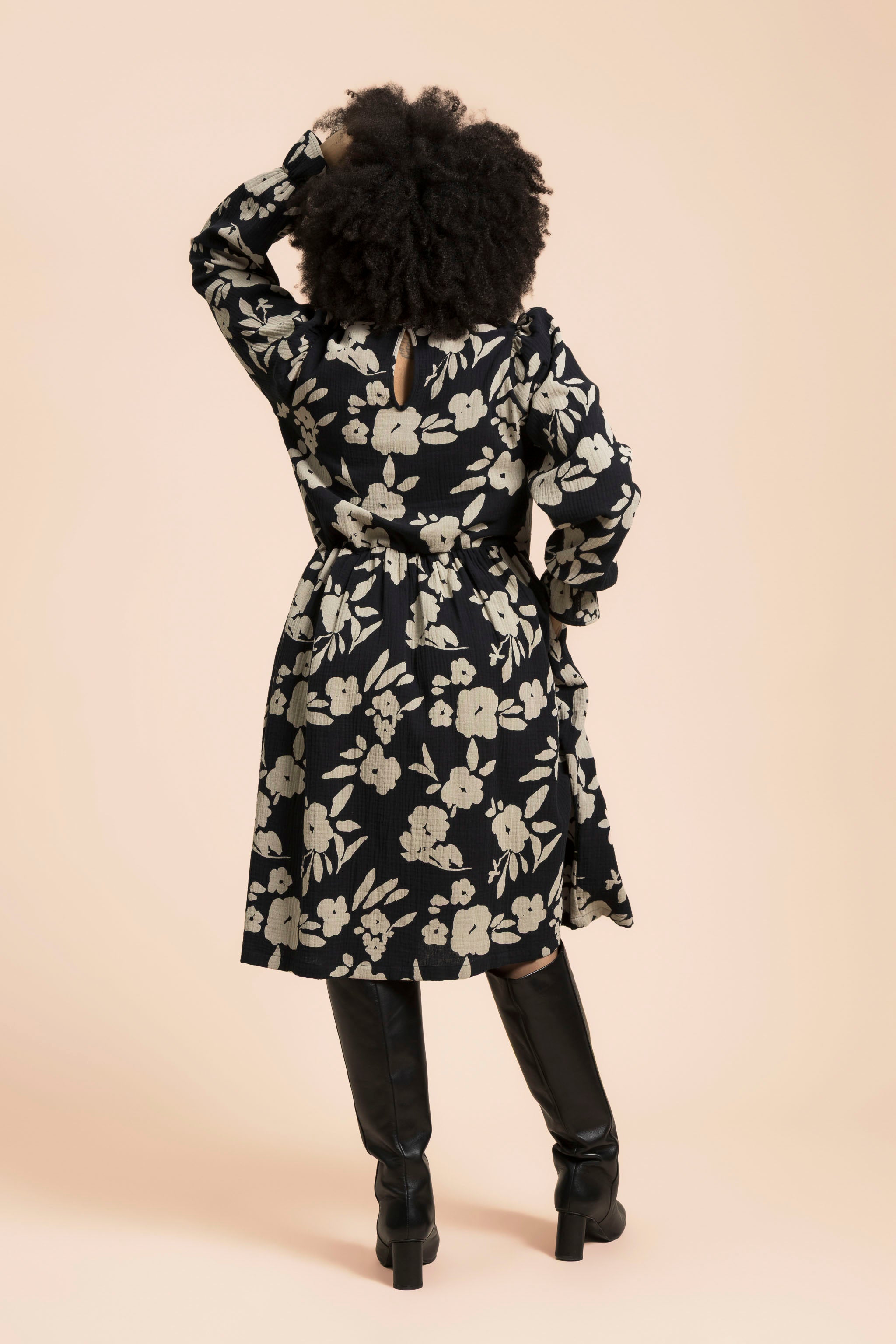 This high-quality women's long-sleeved dress stands out with its beautiful details: the cuffs are gathered with an elastic band and decorated with a delicate frill. There is a small slit at the neck and a button fastening. The pattern is Windflower with a black base and large beige flowers. This timeless women's dress is perfect for both casual daytime wear and the most festive occasions - you can easily transform the style with accessories.