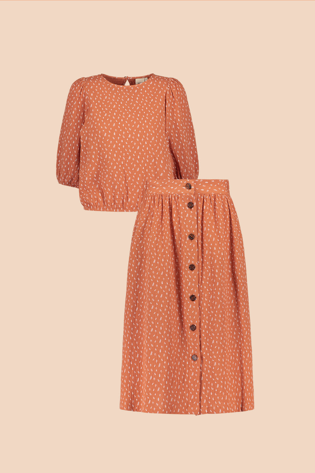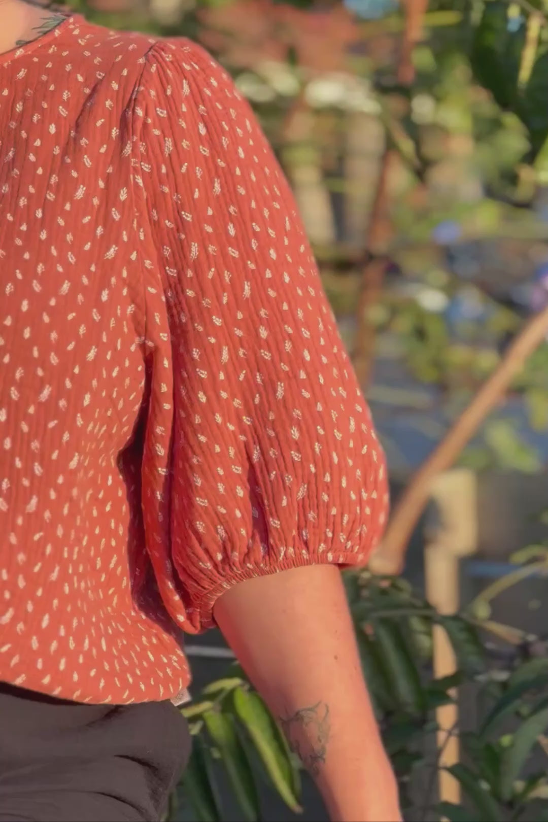 The Cropped Blouse is made of soft and easy-care organic cotton muslin. The muslin fabric has a beautiful, lively texture and does not require ironing at all. The loose Cropped Blouse has puff sleeves and the cuffs are gathered with an elastic band. The shoulder has a gather that creates volume in the sleeves and the sleeves are about forearm-length. The short hem of the blouse is gathered with an elastic band that gathers the looseness of the shirt and creates a beautiful silhouette. There is a small slit at the neck and a button fastening.