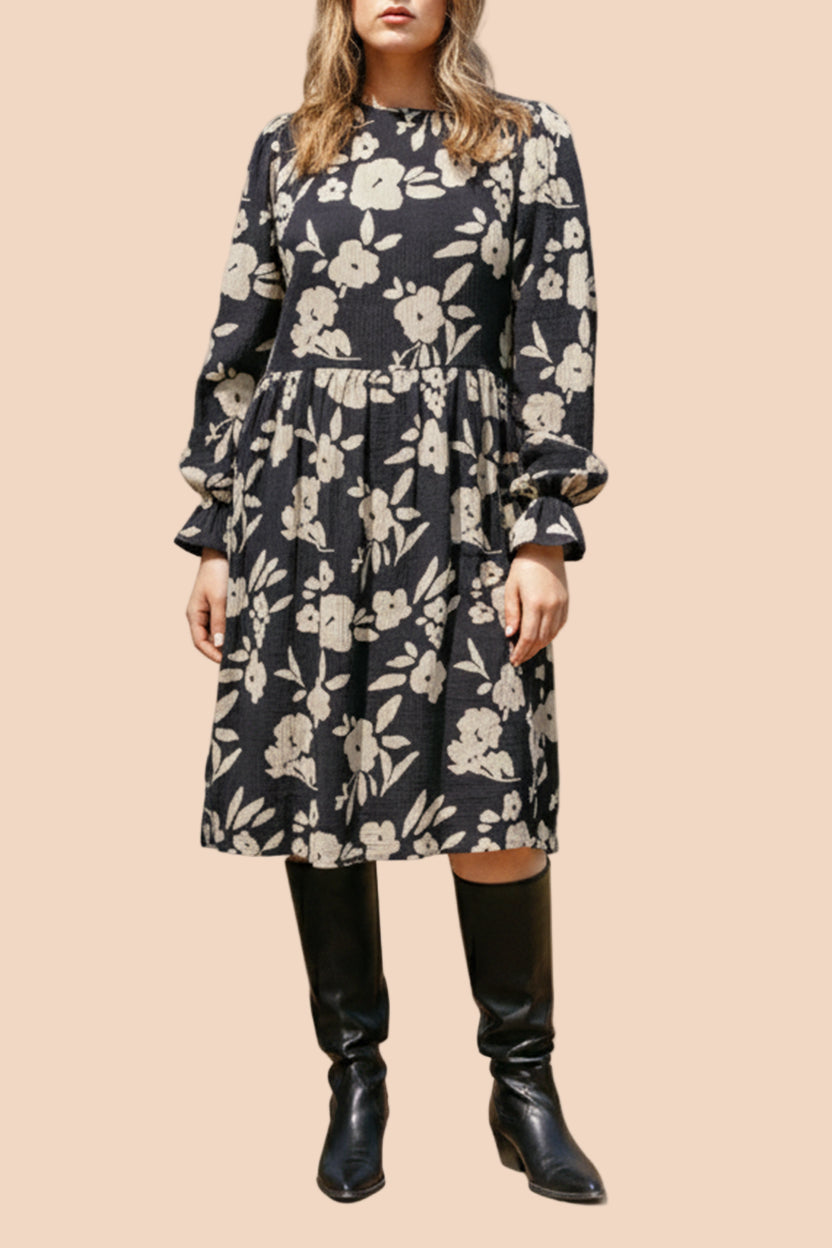 This high-quality women's long-sleeved dress stands out with its beautiful details: the cuffs are gathered with an elastic band and decorated with a delicate frill. There is a small slit at the neck and a button fastening. The pattern is Windflower with a black base and large beige flowers. This timeless women's dress is perfect for both casual daytime wear and the most festive occasions - you can easily transform the style with accessories.