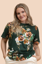 This high-quality women's t-shirt is made of soft organic cotton that feels comfortable to wear. The classic t-shirt has a relaxed fit and can be easily paired with your favorite jeans, skirts, or shorts. The pattern is Rose Yard Green, where roses glow against a dark green background.
