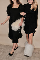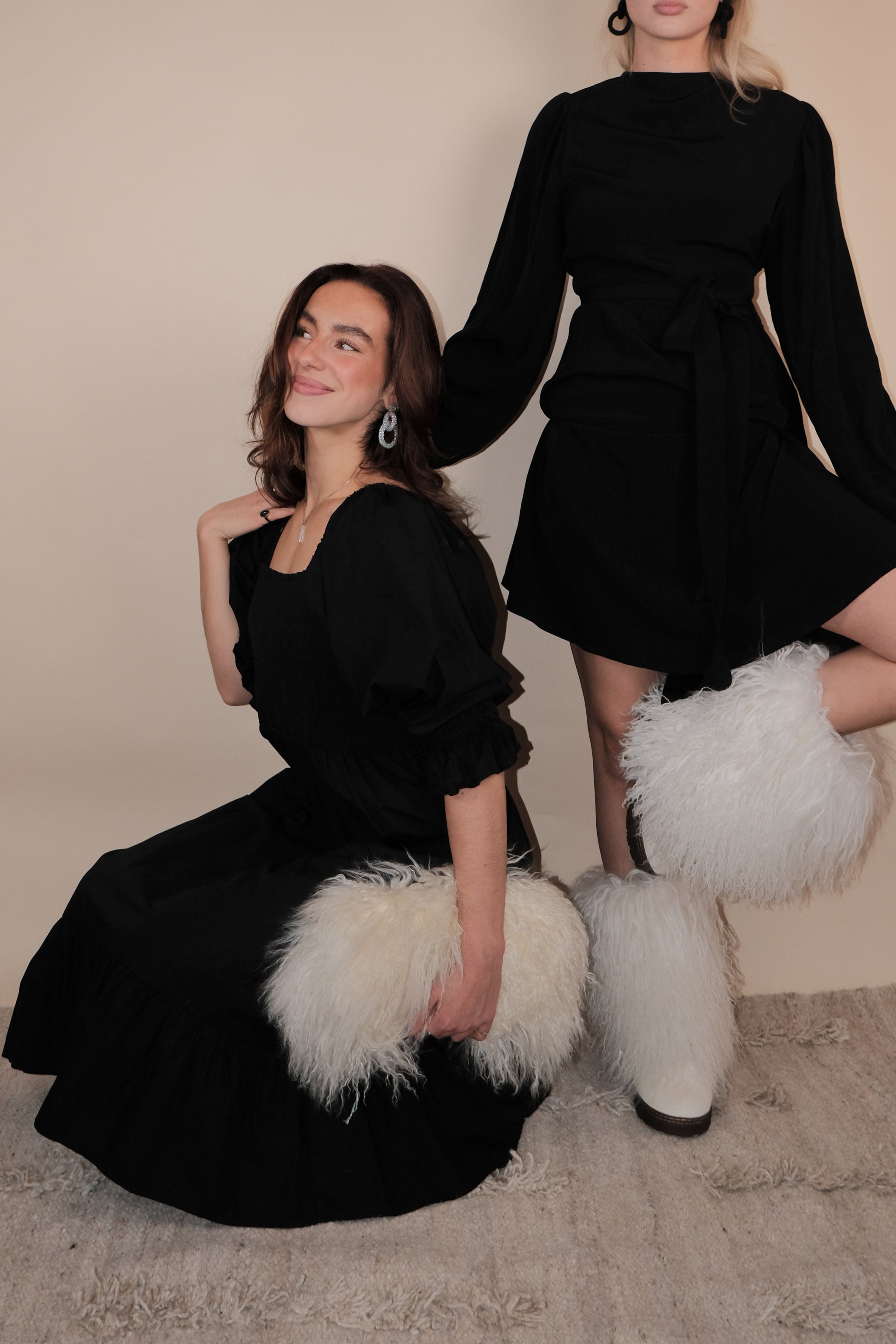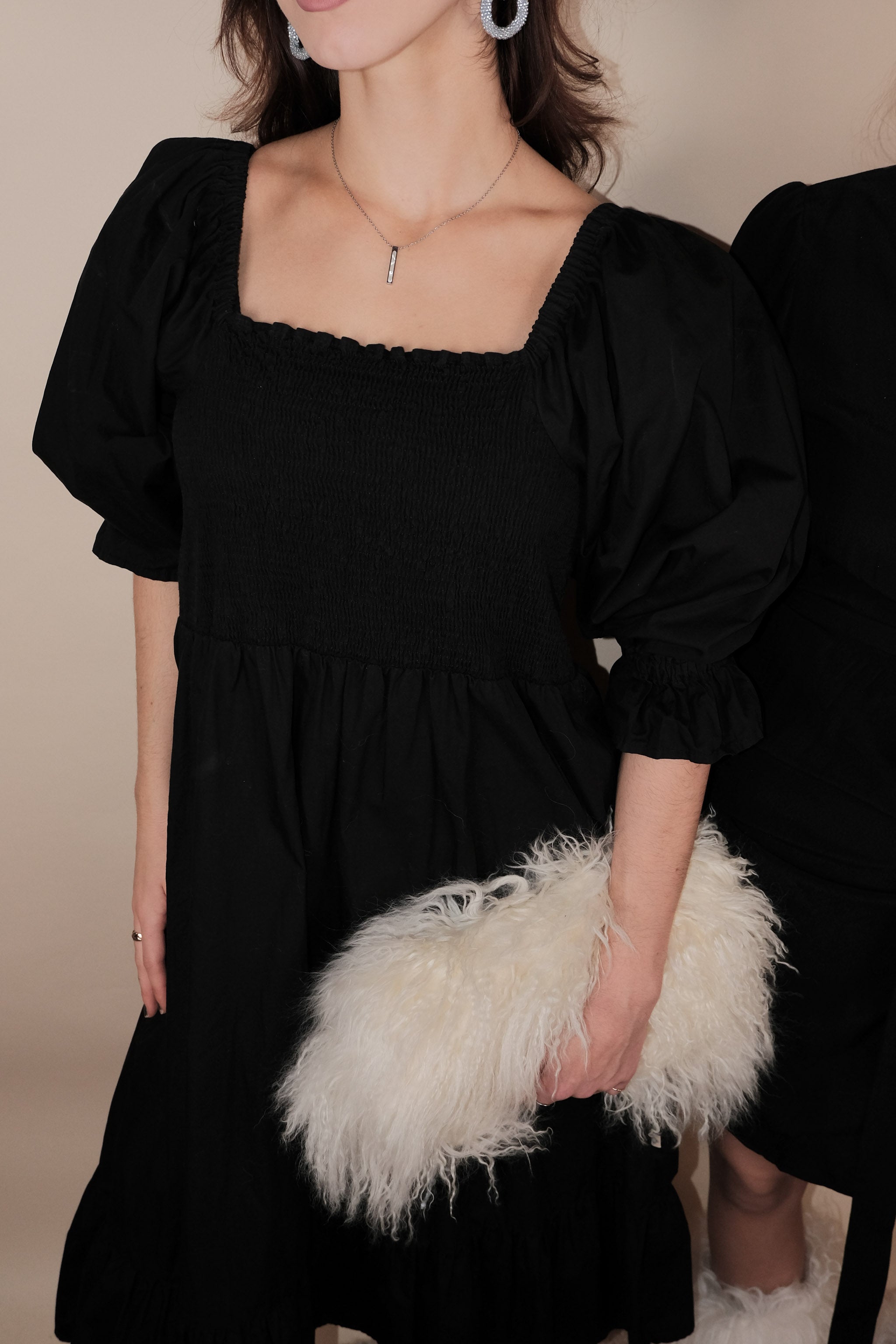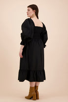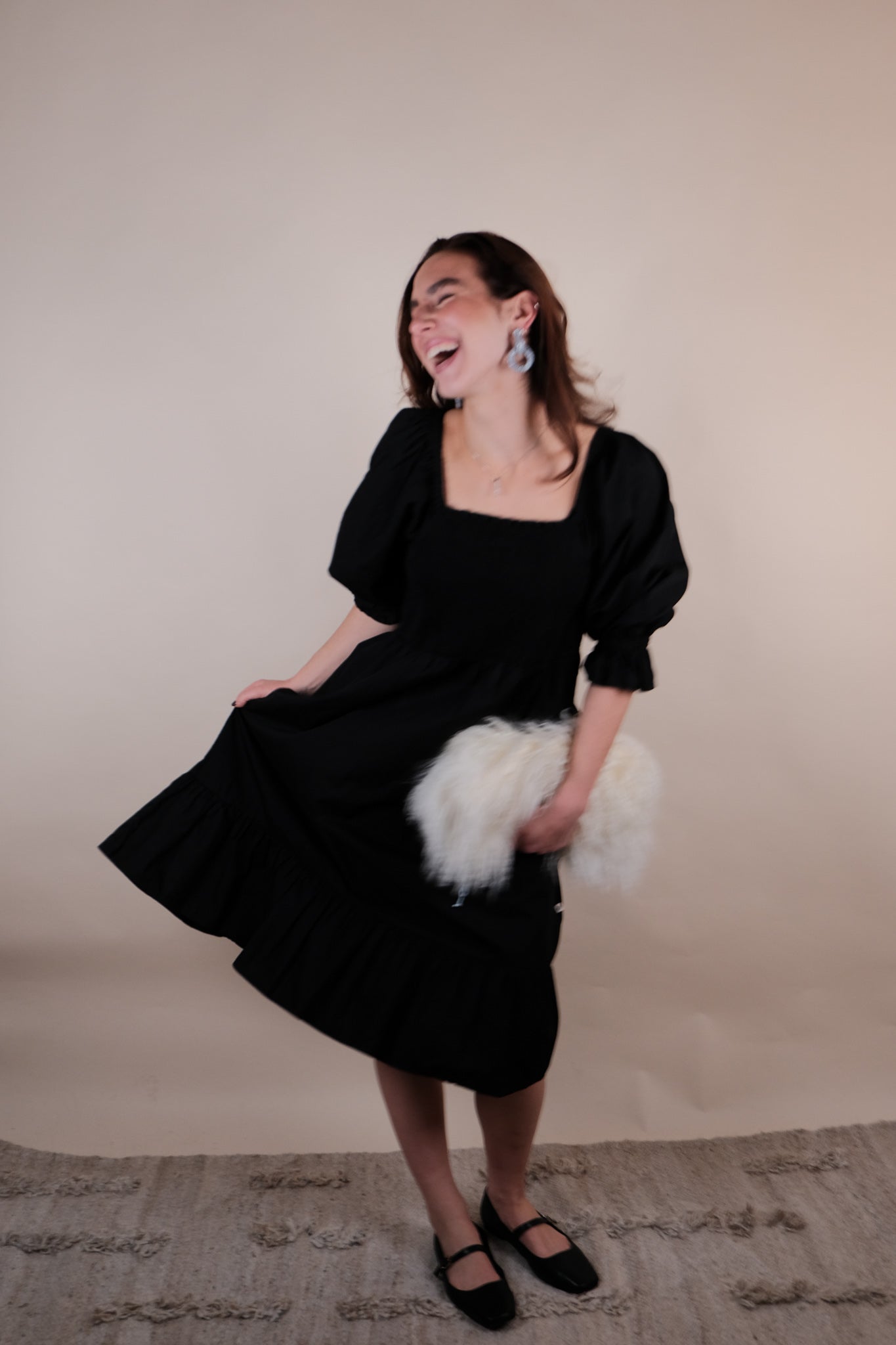 The striking Smock Dress is made of organic cotton poplin. The dress has a square neckline and a fitted tuxedo gathered top. The large puffy sleeves have elastic bands on the shoulder that keep the sleeves well in place. If desired, the sleeves can also be pulled down from the shoulder in an off-shoulder style. The sleeve ends have frill details gathered with elastic. The midi-length flared hem is decorated with a frill. The shade is classic black.