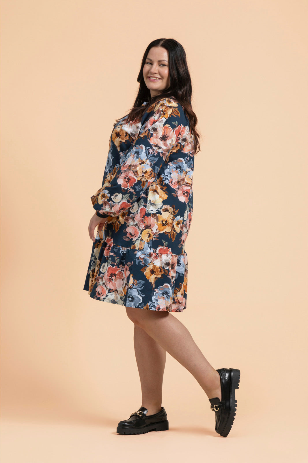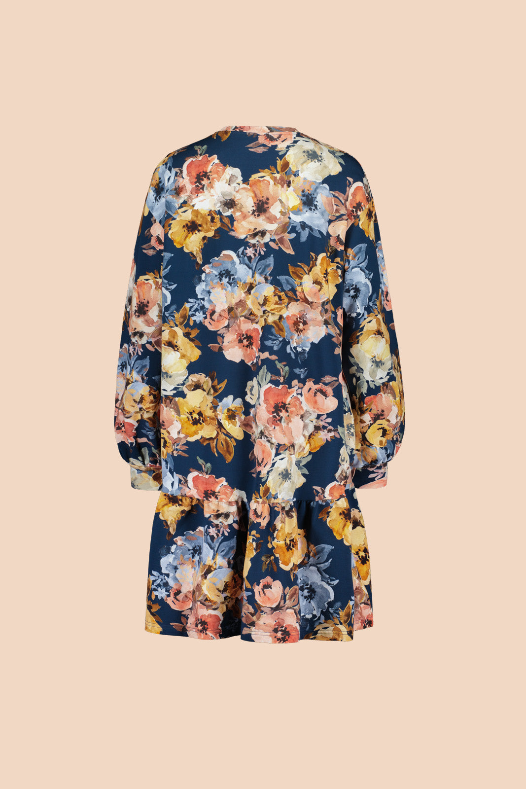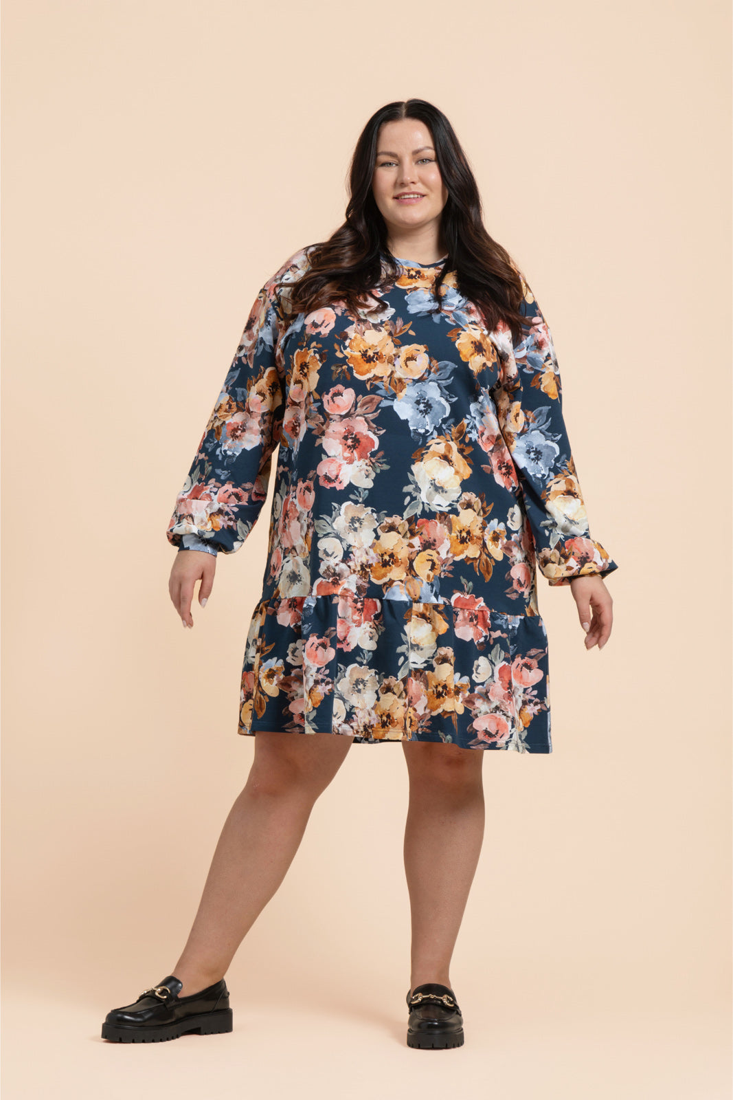 This responsibly made sweatshirt dress is a delight with its relaxed oversized fit and playful frill hem detail. The soft dress has a slightly cropped hem, dropped shoulders and full sleeves. The dress features a petrol blue-based floral print called Moss Rose.