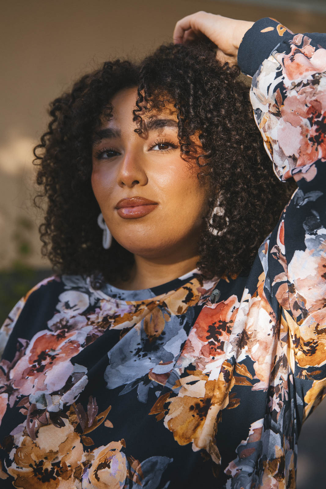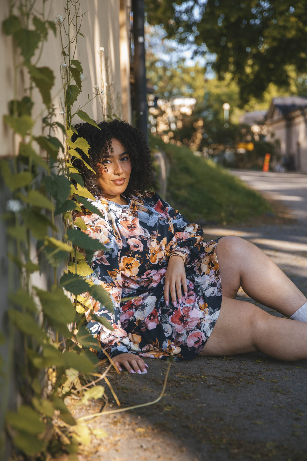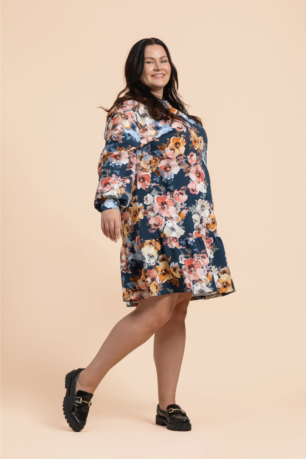 This responsibly made sweatshirt dress is a delight with its relaxed oversized fit and playful frill hem detail. The soft dress has a slightly cropped hem, dropped shoulders and full sleeves. The dress features a petrol blue-based floral print called Moss Rose.