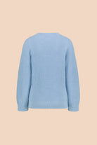 The sweater has a v-neck, a fitted shoulder and full-length, wide sleeves. The hem and cuffs have a ribbed knit. The sweater has a relaxed and loose design. The color of the sweater is light blue.