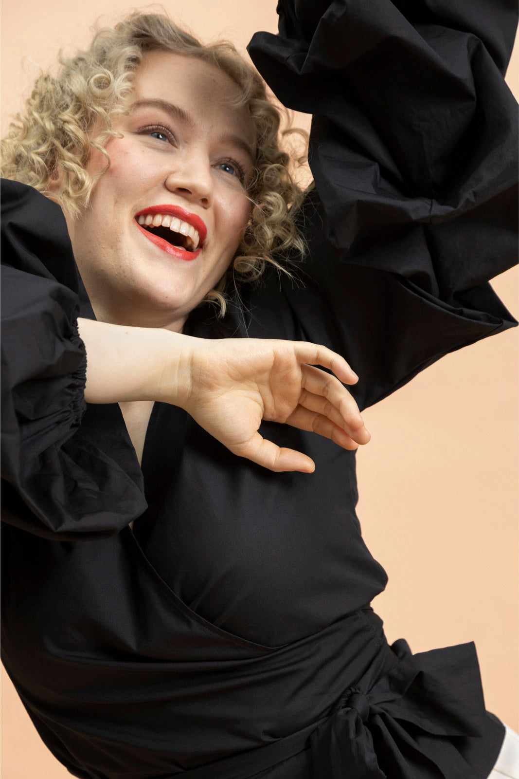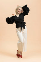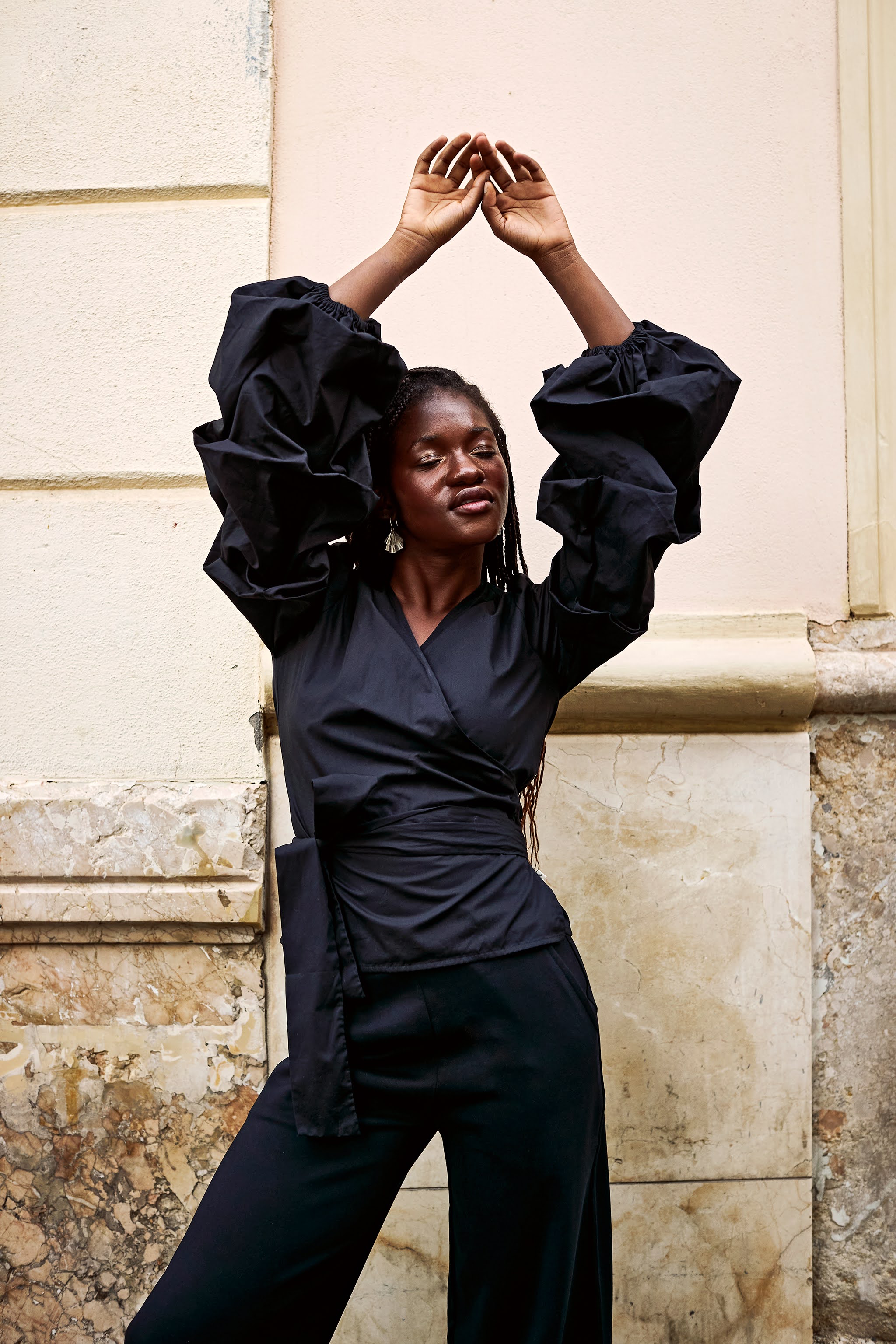 The wrap shirt features tie-up straps at the waist and generous, layered full-length sleeves. The cuffs are gathered with an elastic band. The flattering wrap cut and adjustable waistband ensure a perfect fit for every body type. A striking and dramatic black shirt is the perfect choice for parties and other special occasions.