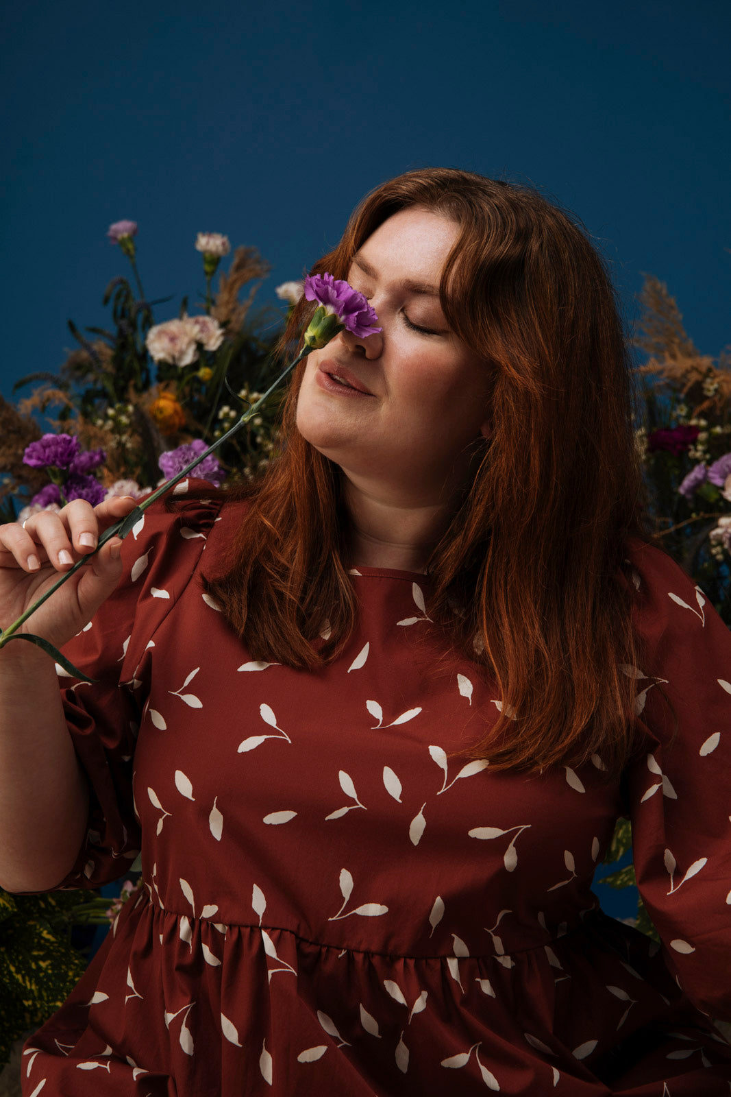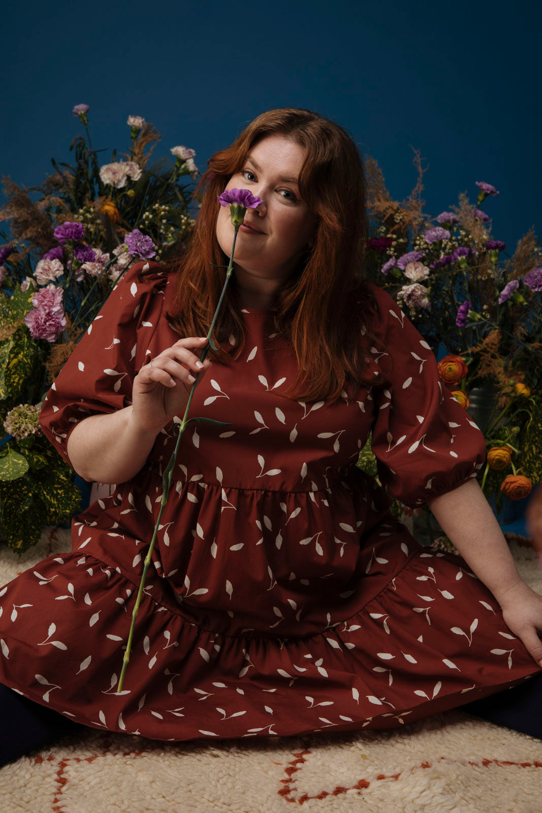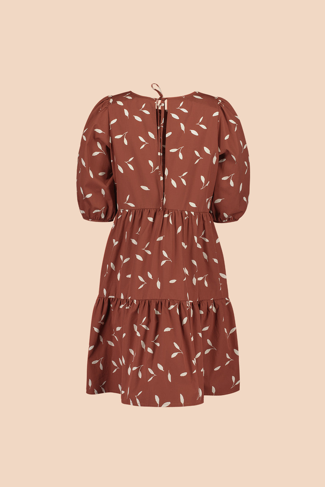 The Tiered Mini Dress is made of smooth organic cotton poplin. The loose dress has half-length puff sleeves and a generous layered minimal hemline. Tape fastening at the neck and a deep slit at the center back seam that extends to the waist seam. The dress pattern is minimalistic and serene Wind, where off-white petals flutter on a mahogany-toned base.