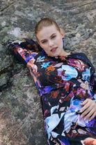 The Midi Belted Dress, made of soft organic cotton tricot, has a feminine and close-fitting design. The side seams of the dress have wide bands that emphasize the waist, which can be tied either in front or behind. The length of the hem is about the sole of the foot, and there are 20 cm slits in the side seams. The dress has long sleeves. The Midi Belted Dress is easy to style for both weekdays and parties. Black Anemone as a tricot dress, where large watercolor flowers sprawl on a black background.