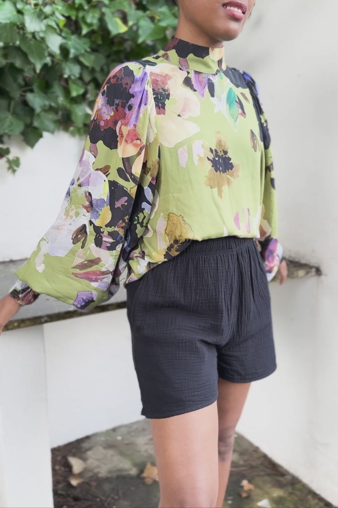 Ease Shorts are made from a wonderfully soft woven organic cotton muslin with a beautiful, vibrant texture. The relaxed muslin shorts have a high waist and a wide elastic waistband that makes them super comfortable to wear. They have pockets at the front and small slits at the side seams. They come in a classic black color.