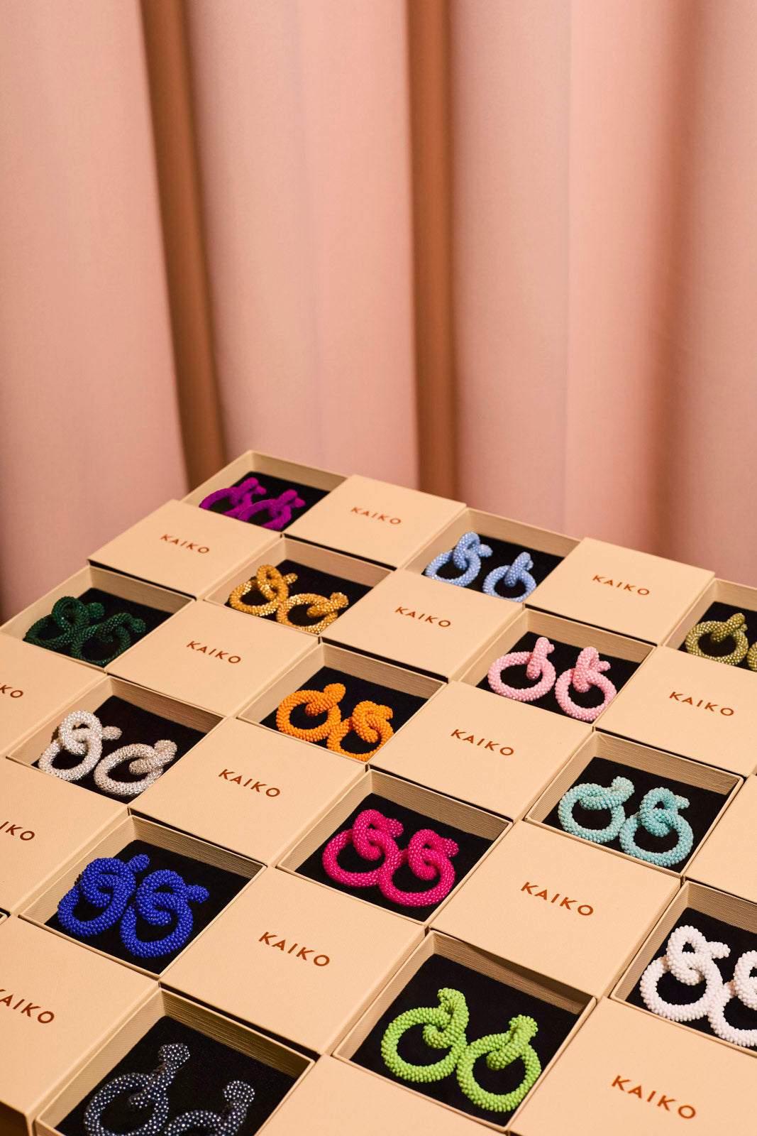 The earrings are made from individual glass beads that are braided together. One pair of Gia earrings has up to around 1500 glass beads! Up to 5 jewelers participate in the production of different parts of the jewelry, and it takes about 2 hours to make one pair of earrings in total.