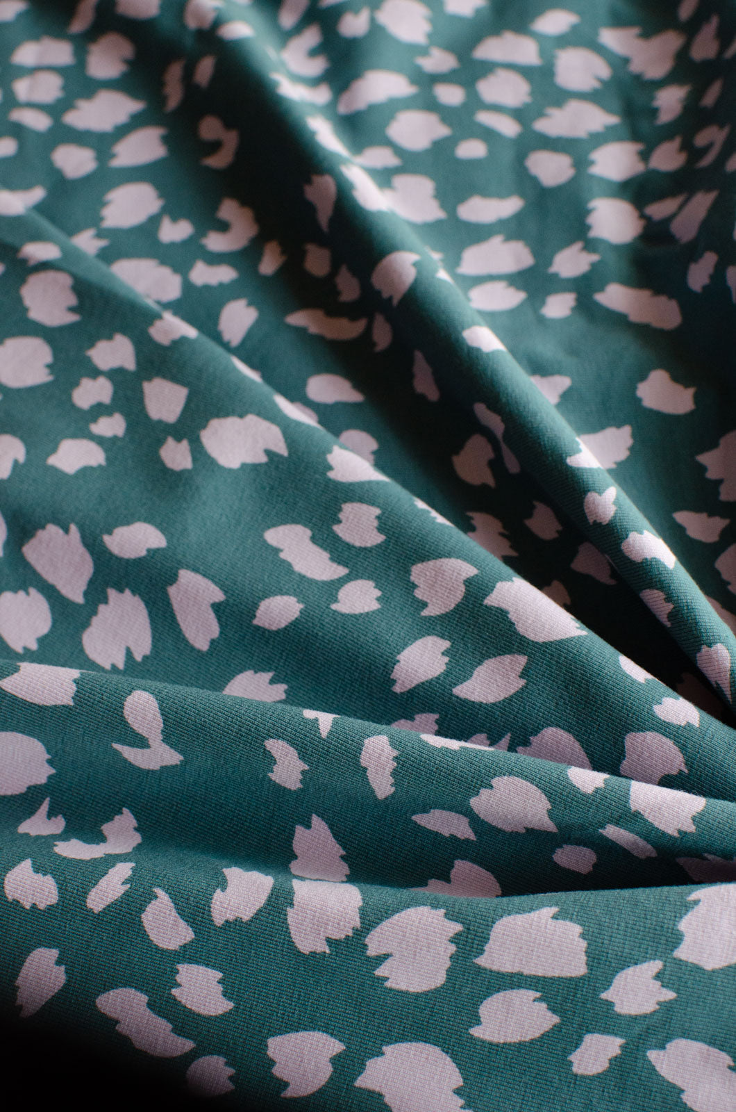 Green Safari pattern now in tricot, slightly thinner 100% organic cotton quality! The knitwear is delivered pre-cut in 2m pieces. Organic cotton jersey is a very soft and thin knitwear that you can make or have customized to your taste, whether it's jersey shirts, dresses or leggings - for adults or children!