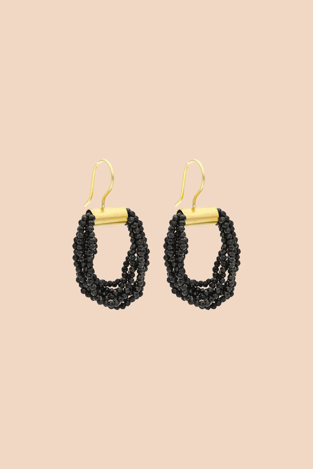 Kaiko's stylish Kaneila earrings are handcrafted in Nepal. The eye-catching feature of the jewelry is the black crystal beads. The earring fasteners are brass and nickel-free, but they can irritate very sensitive skin. The total length of the jewelry is 4.5 cm.