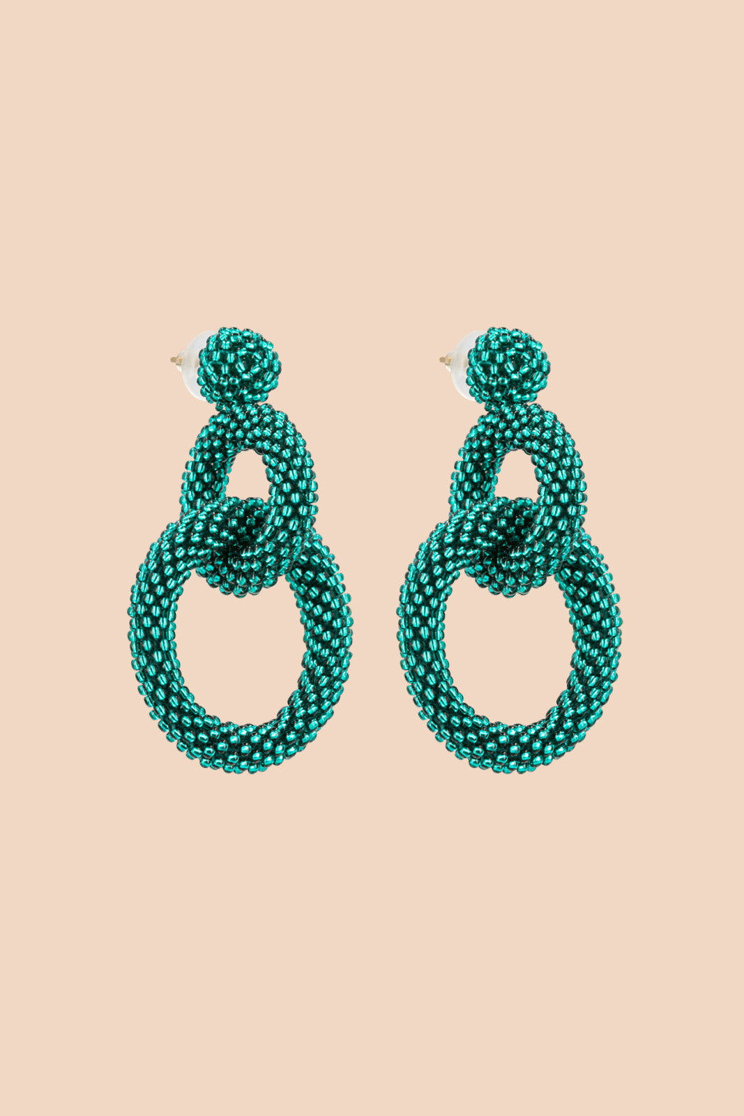 The earrings are made from individual glass beads that are braided together. One pair of Gia earrings contains up to 1500 glass beads! Up to 5 jewelers participate in the production of the different parts of the jewelry and it takes about 2 hours to make one pair of earrings.