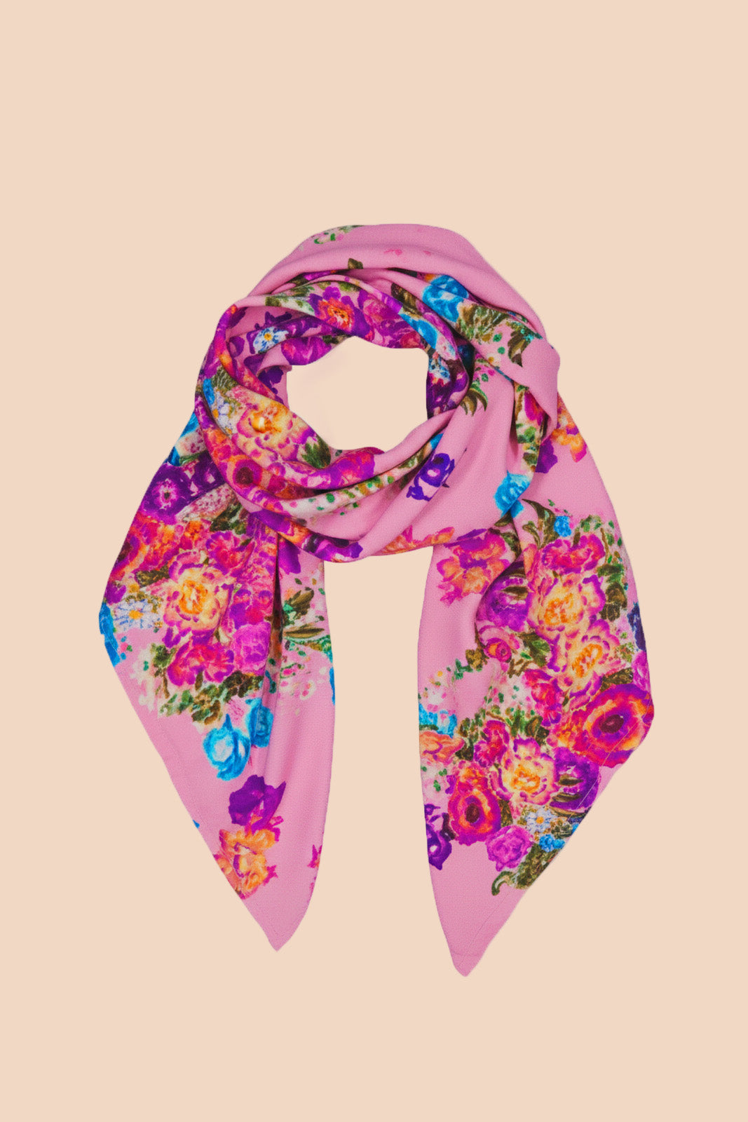 This versatile and timeless scarf is perfect for everyday wear or for a special occasion - you can wrap it around your hair, neck or head. Thanks to its large size, you can tie it into a top if you want. The high-quality scarf has a neat narrow hem at the edges. The pattern is striking Pink Marigold.